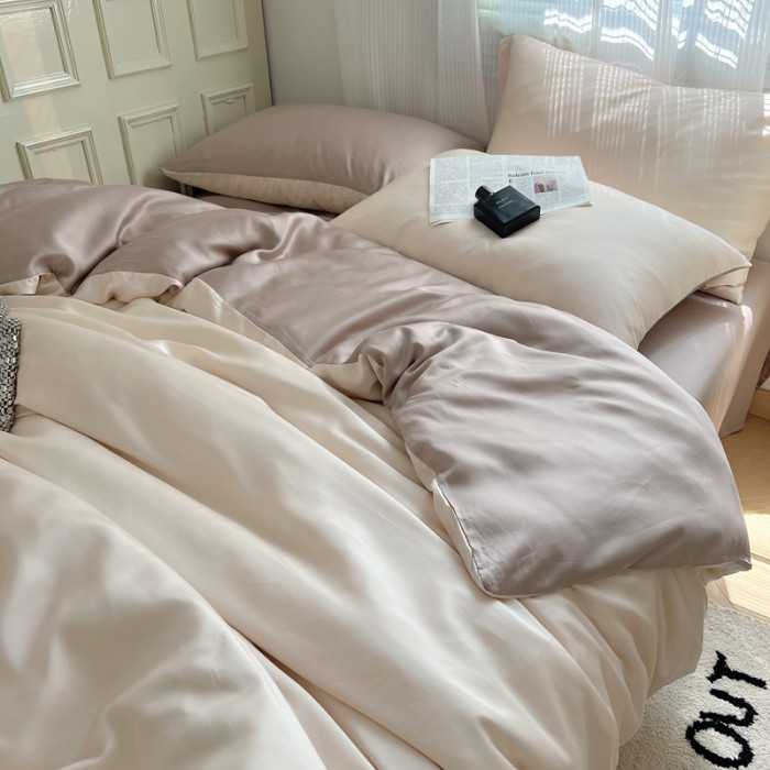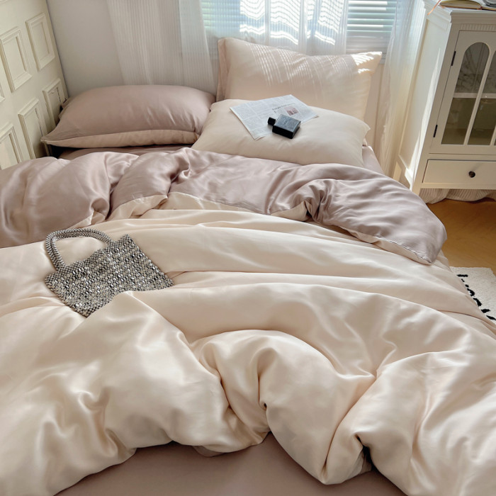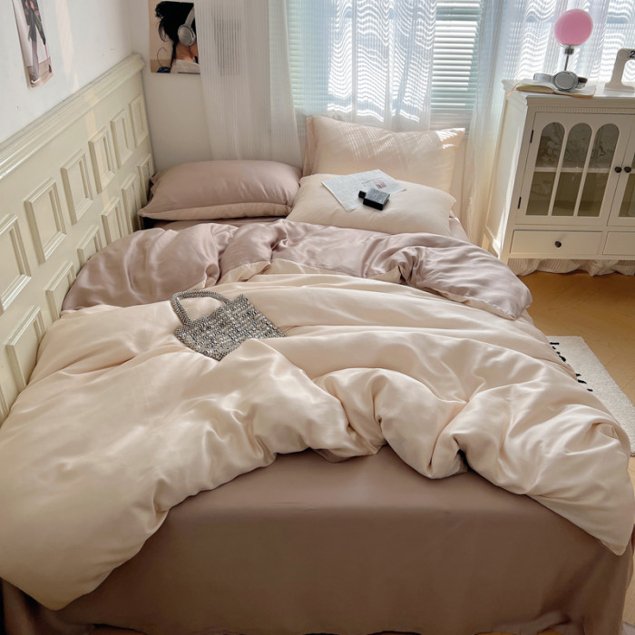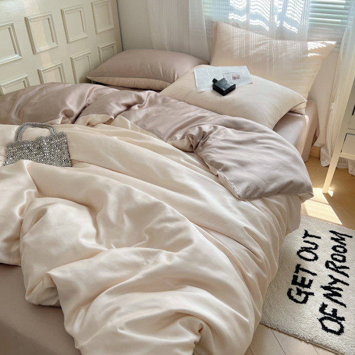 奶油可可白棕冰絲床單四件套夏季涼感水洗真絲被套被單宿舍三件套