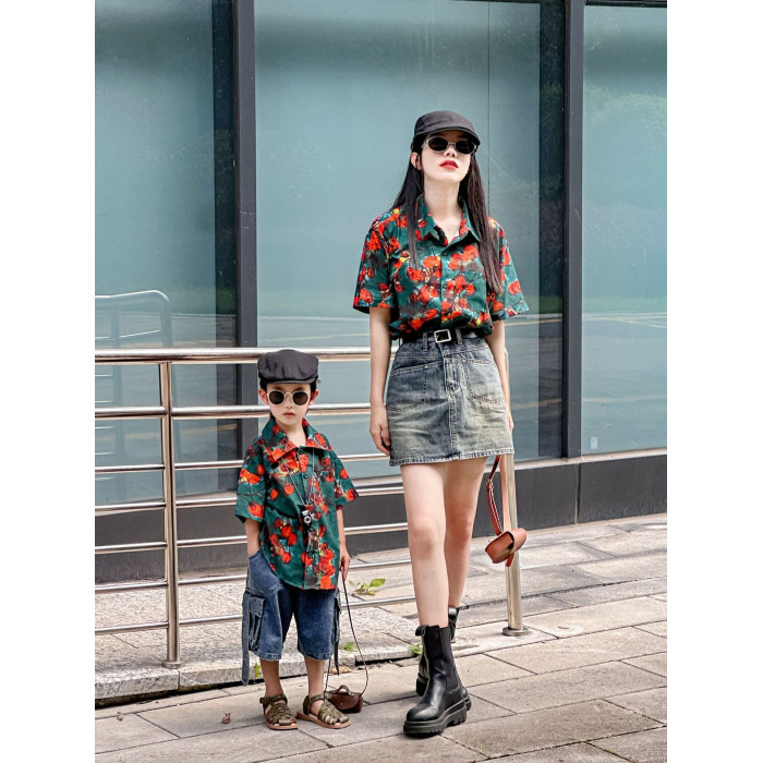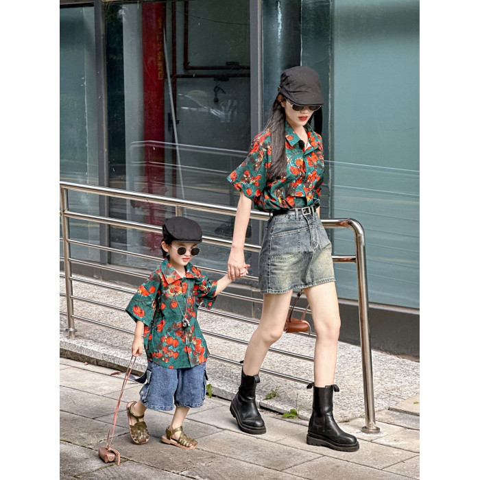 親子裝夏裝2025新款度假高級爆款襯衣夏季洋氣母子港風碎花襯衫潮
