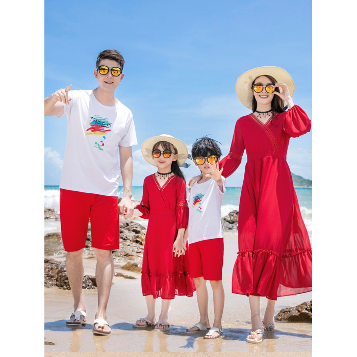 高級親子裝夏季一家三四口家庭裝海邊度假波西米亞沙灘雪紡連衣裙