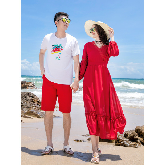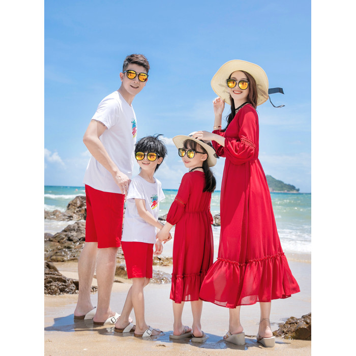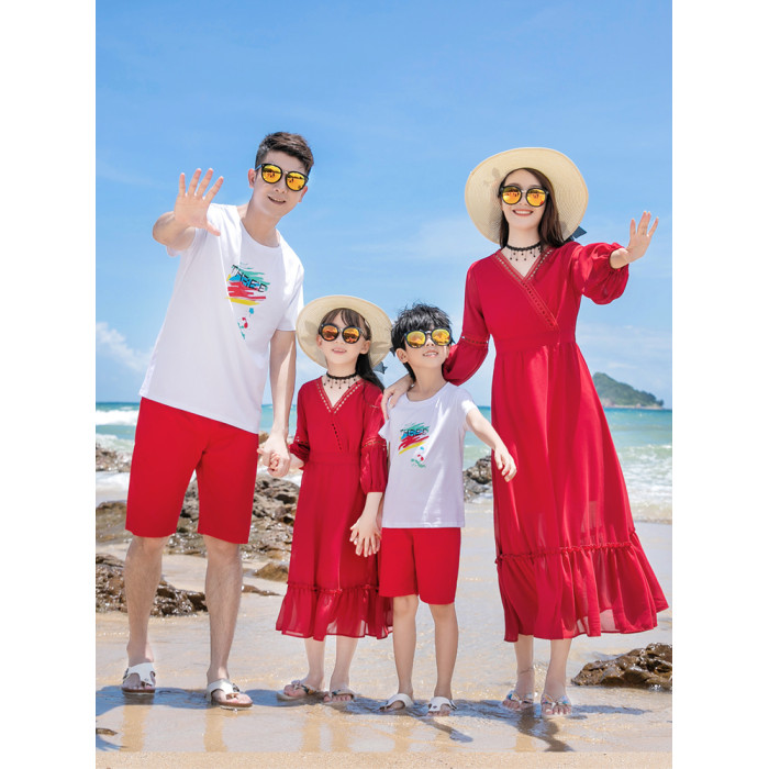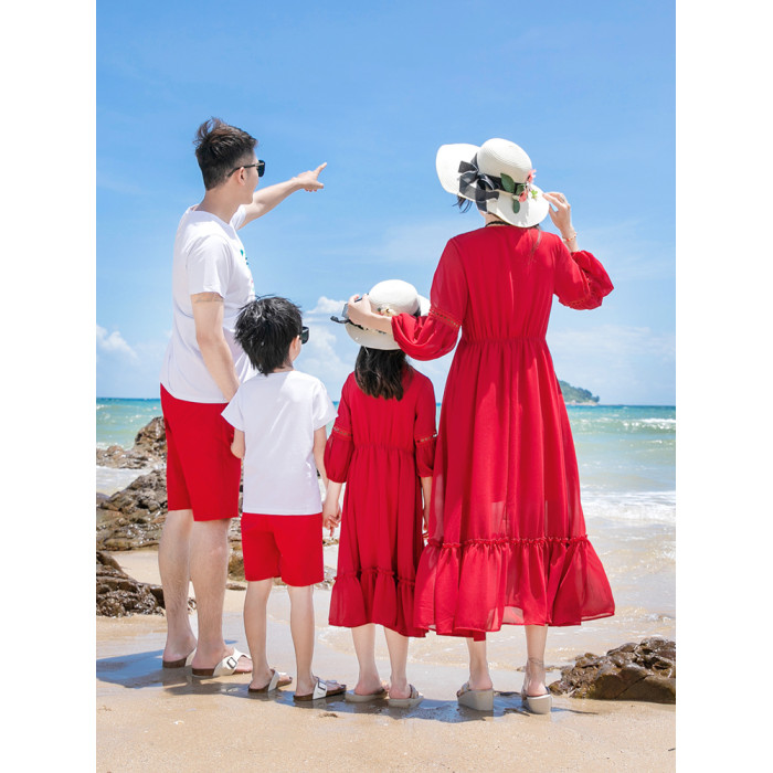 雲南青海茶卡鹽湖草原沙漠親子裝紅色長袖母女連衣裙海邊沙灘長裙