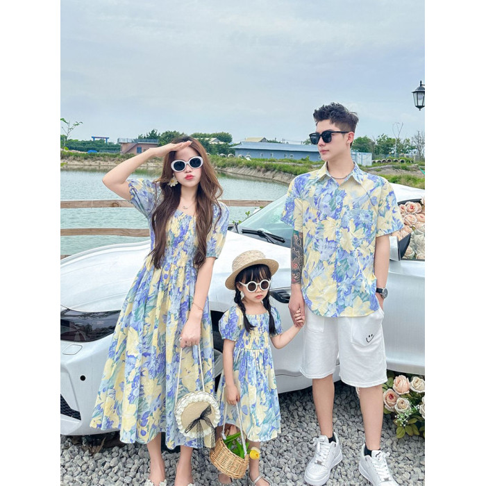 度假風親子裝2025新款夏天海邊一家三口四口襯衫母子母女裝連衣裙
