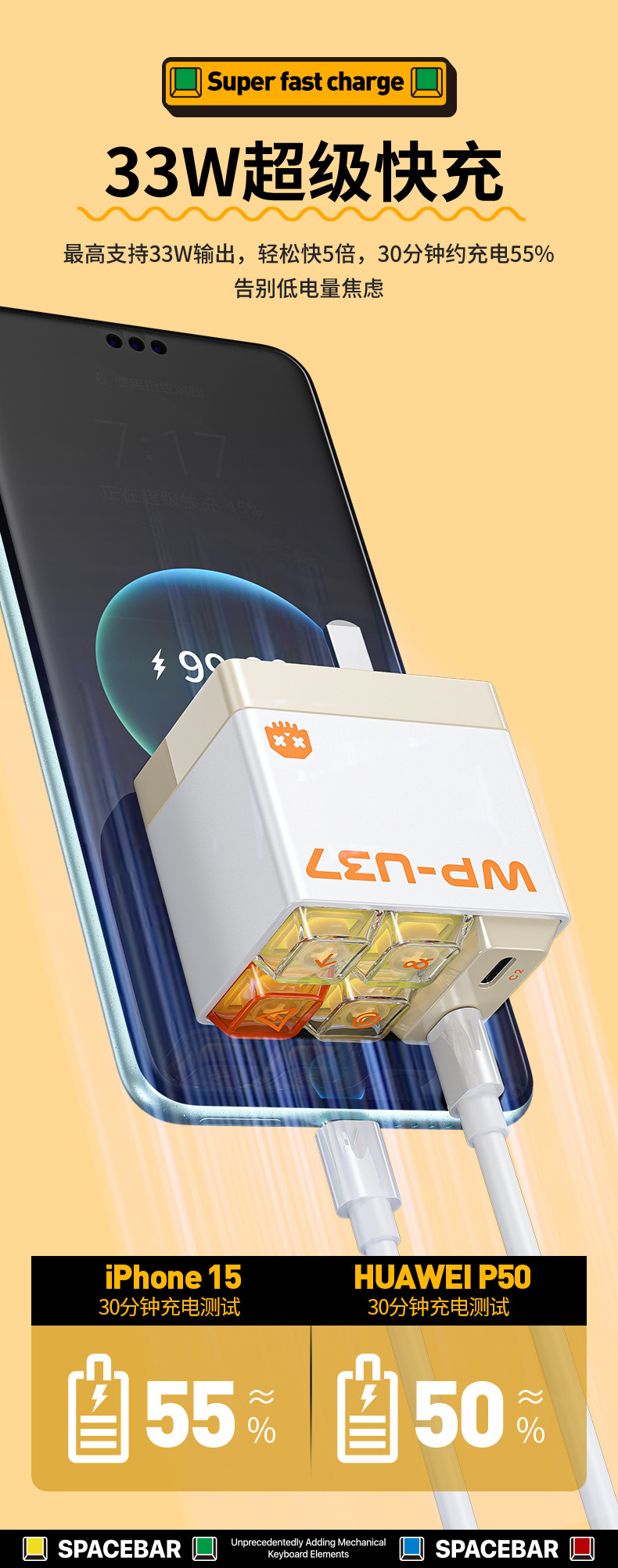 WEKOME鍵盤氮化鎵充電器PD33W快充充電頭適用蘋果手機雙C口禮品