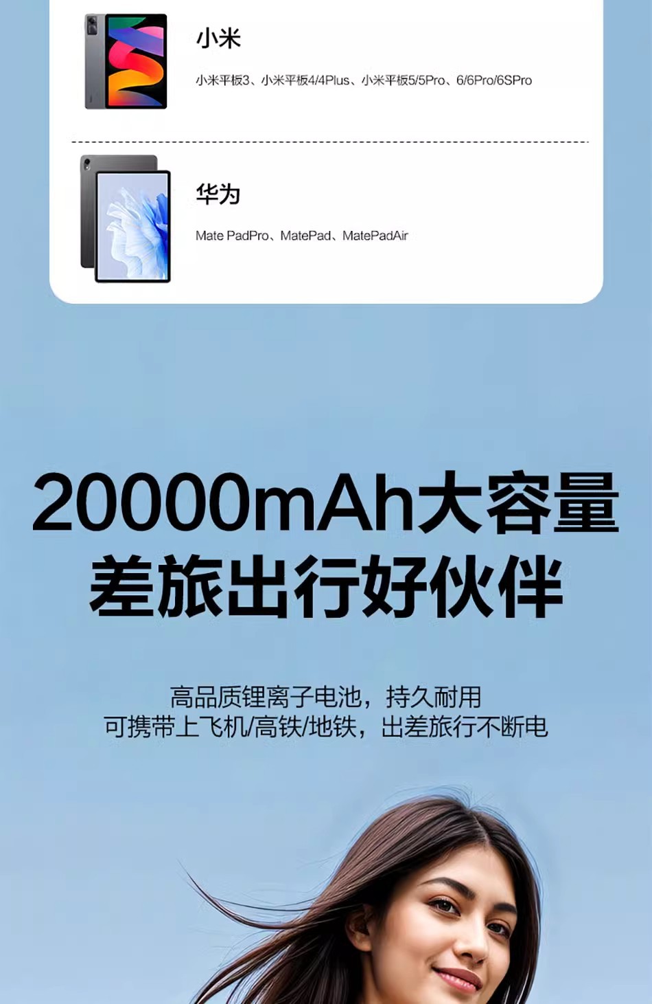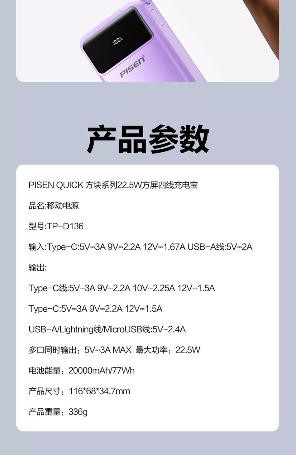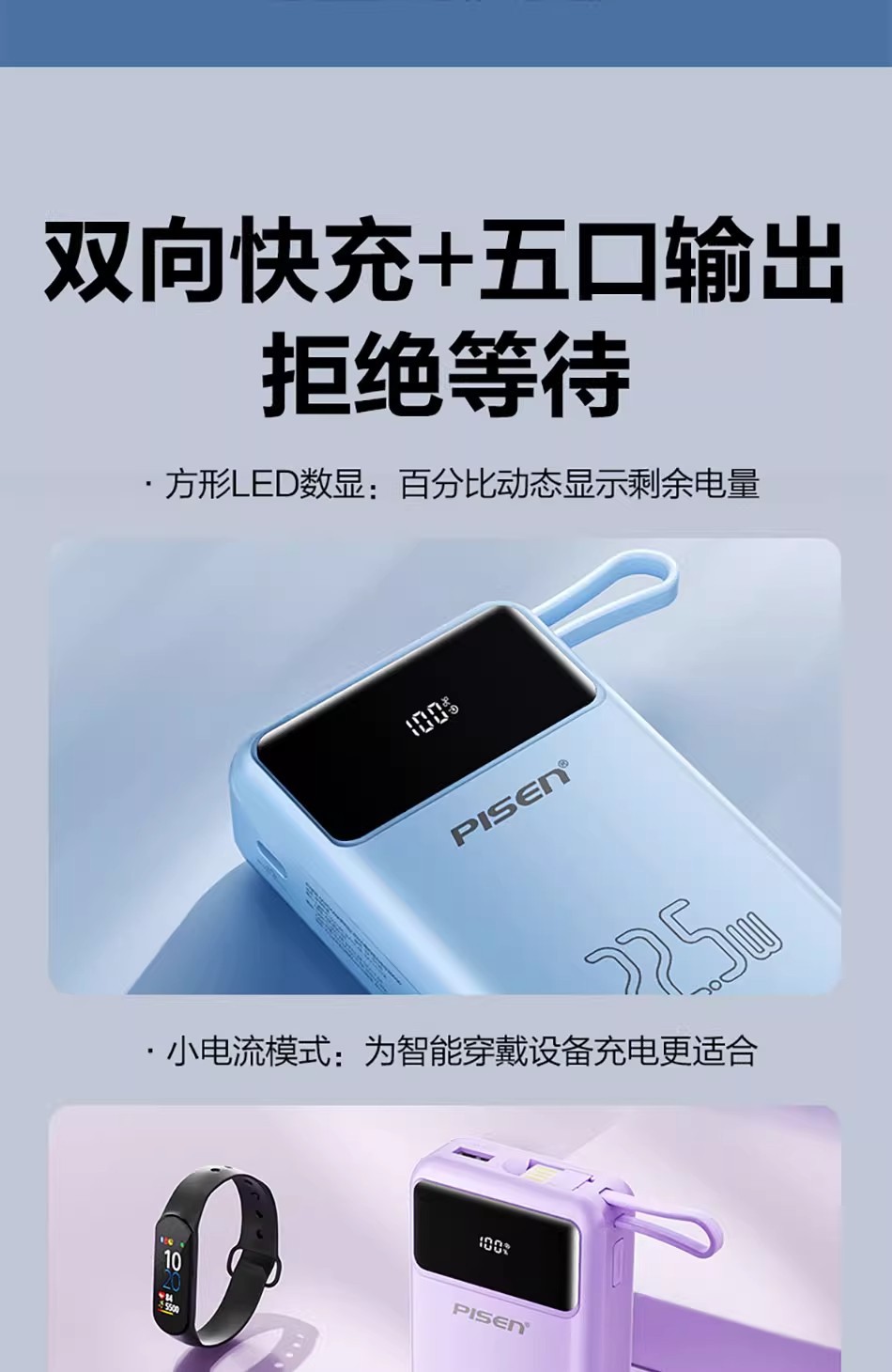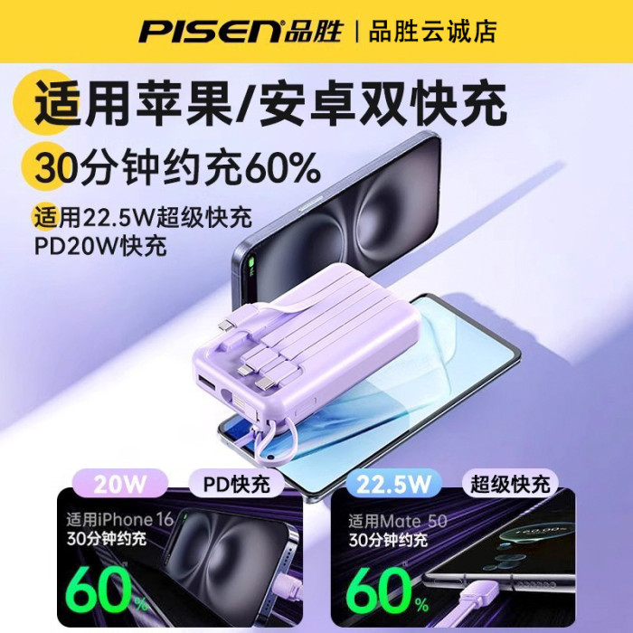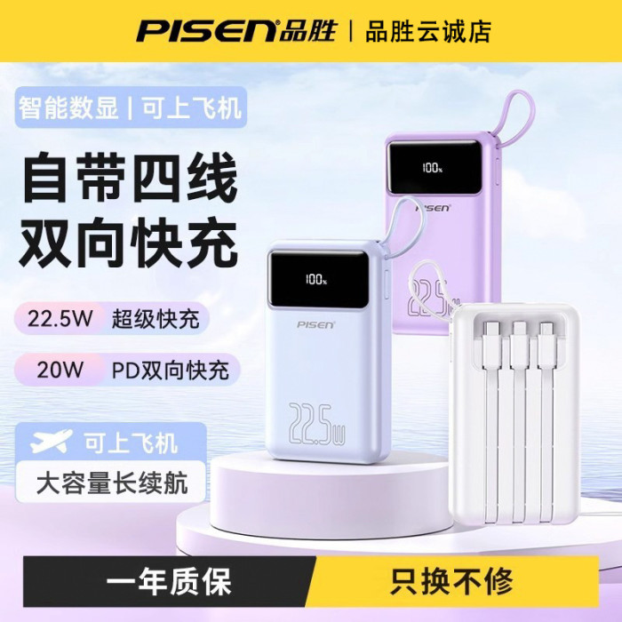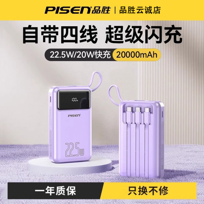 品勝20000安培充電寶數顯適用華爲蘋果安卓自帶線22.5W快充四線