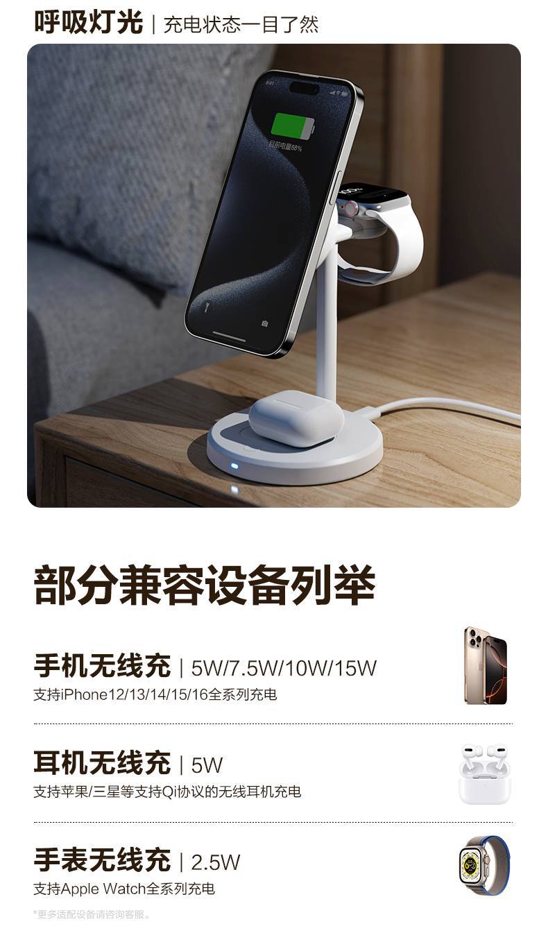 品勝三合一無線充電器適用蘋果14手機手錶藍牙耳機iphone16Pro充
