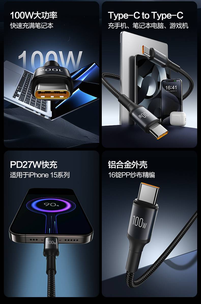 品勝雙頭typec數據線PD100W超級快充適用蘋果iPhone15promax華爲P