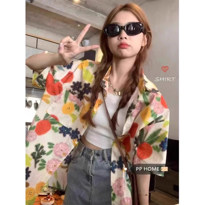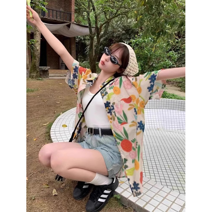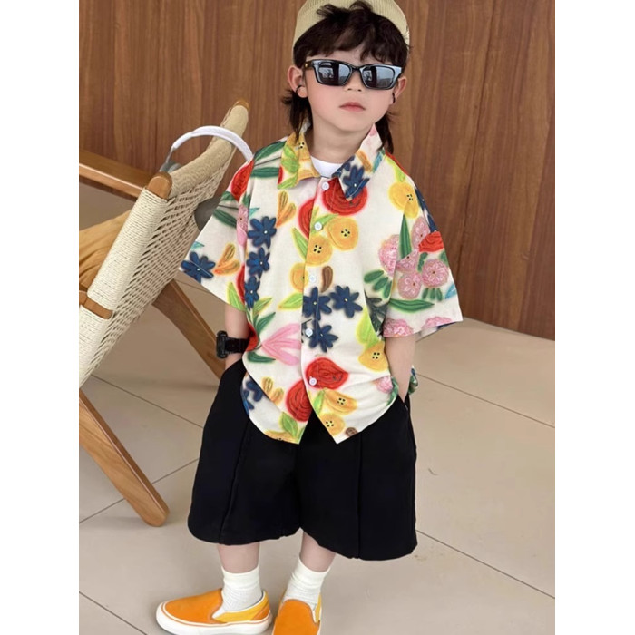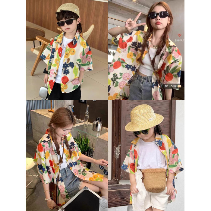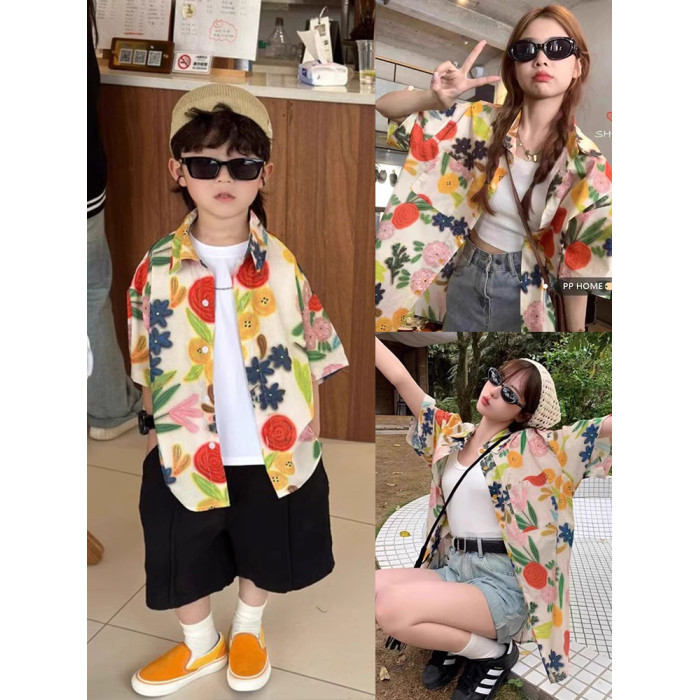 2024新款親子裝夏天短袖套裝一家三口復古港風沙灘度假母子花襯衫
