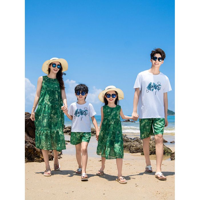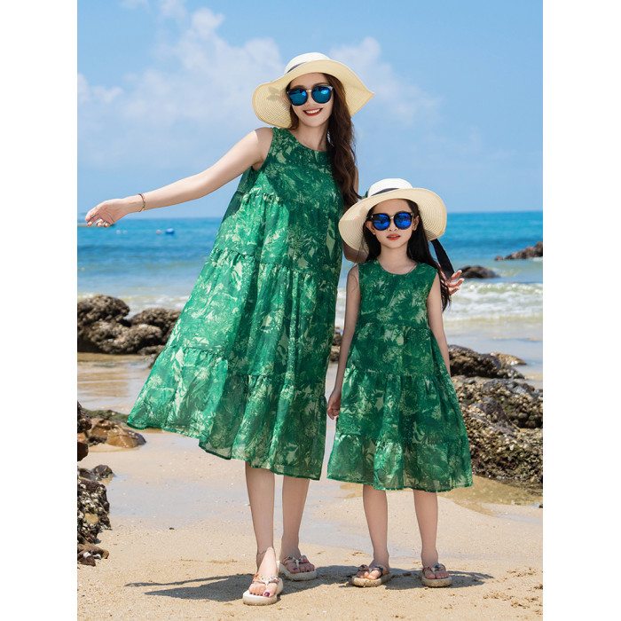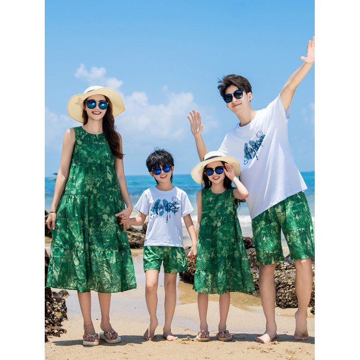 親子裝夏季一家三四口沙灘套裝三亞風海邊度假母女無袖休閒連衣裙