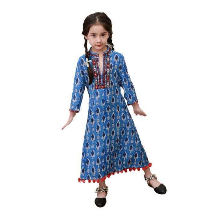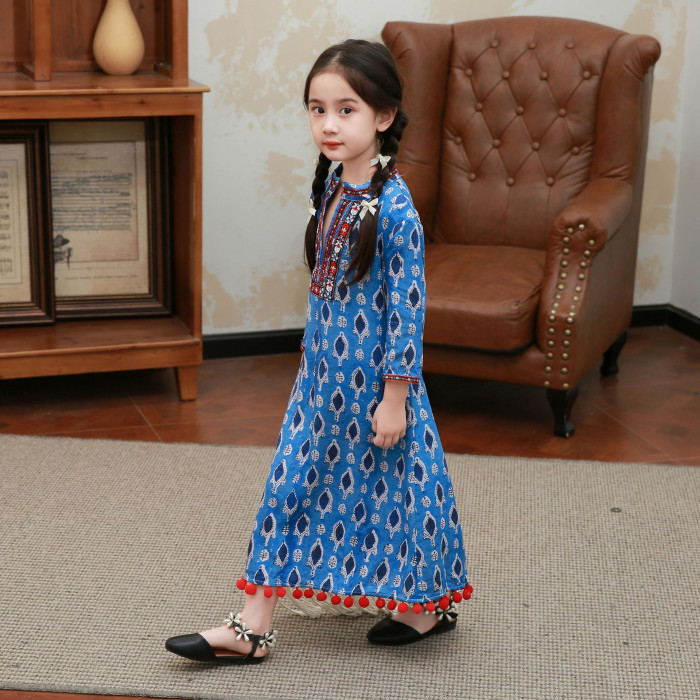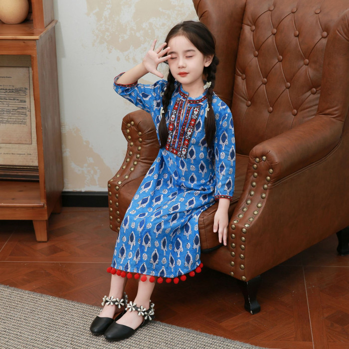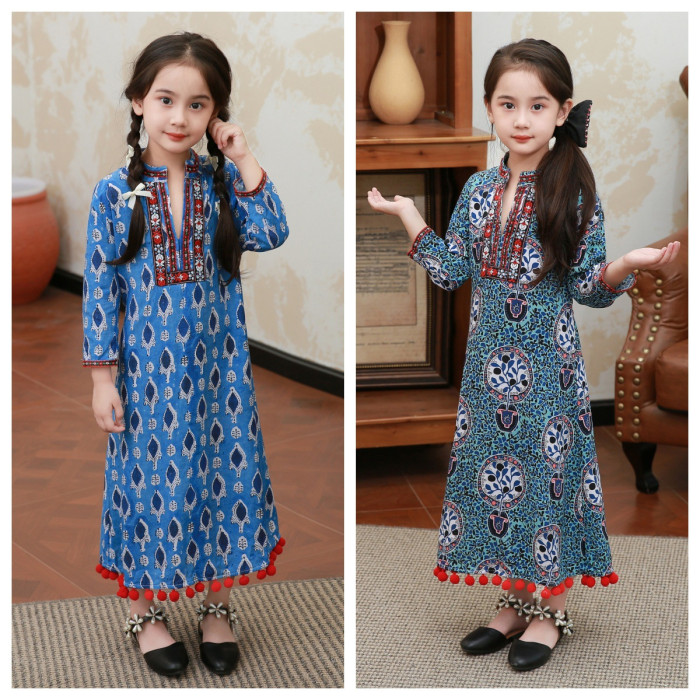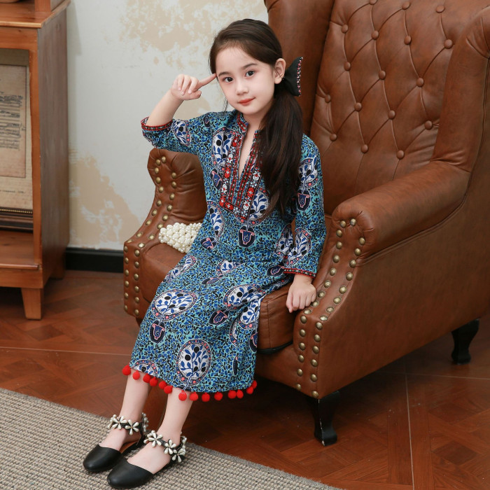 親子裝海邊沙灘裙波西米亞風連衣裙兒童母女裝綿綢女童七分袖長裙