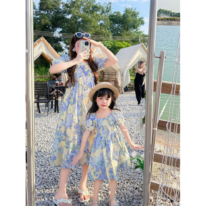 海邊度假親子裝母女款沙灘連衣裙一家三口四出遊母子夏威夷花襯衫