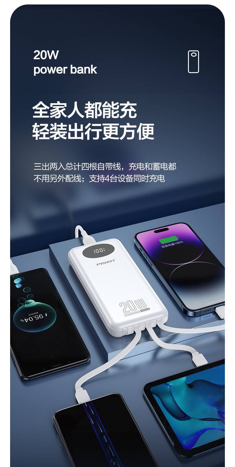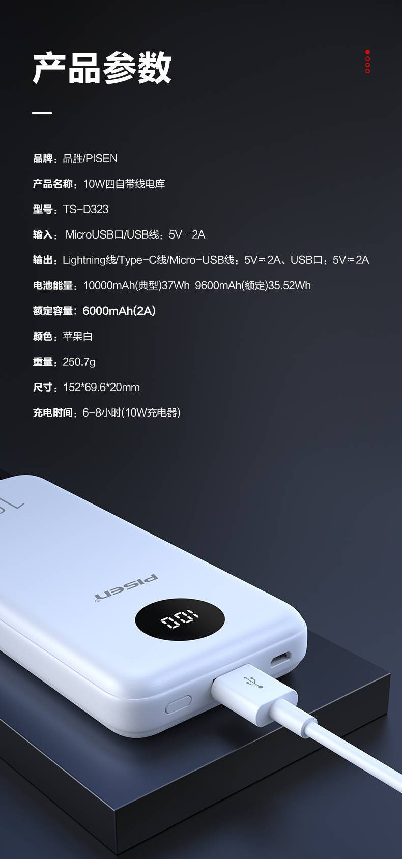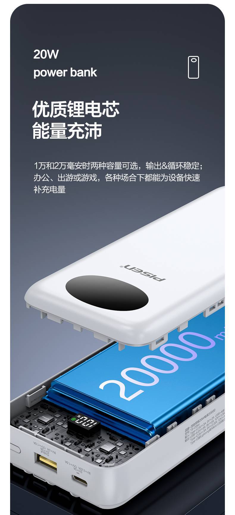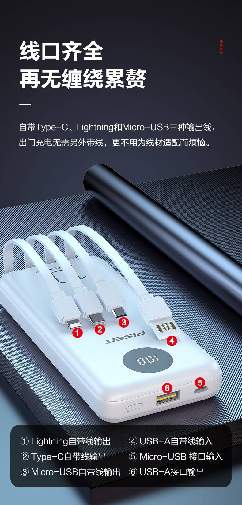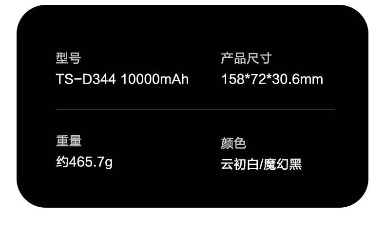 電源容量 | 2萬毫安-20W白色*自帶4線充電寶【TS-D344】 |