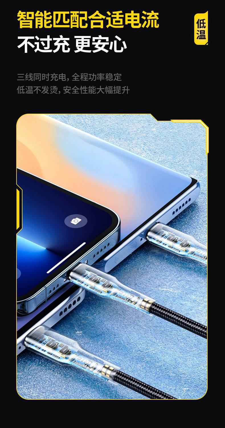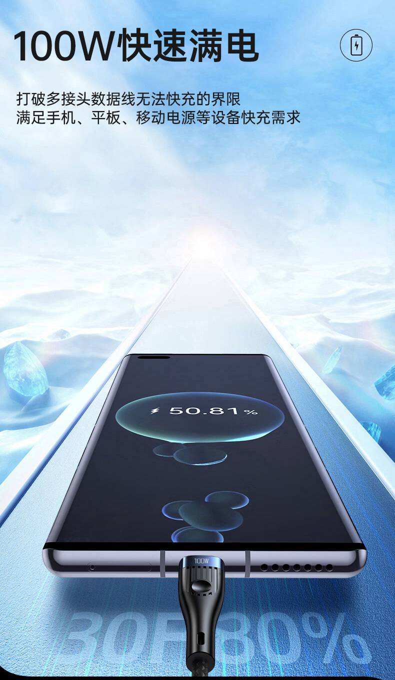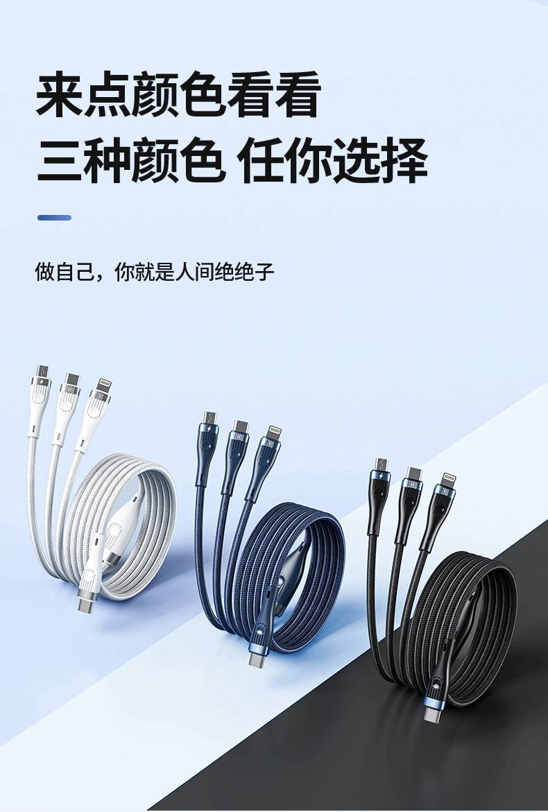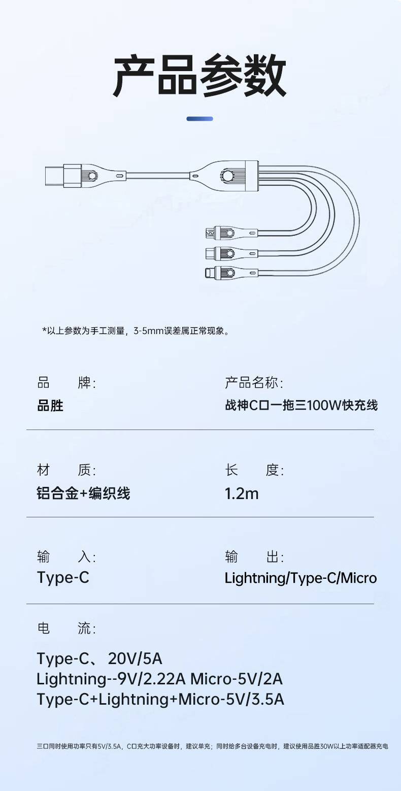 品勝type-c口一拖三數據線快充三合一100W適用蘋果華爲編織線