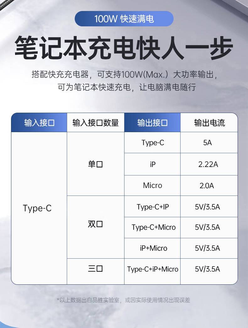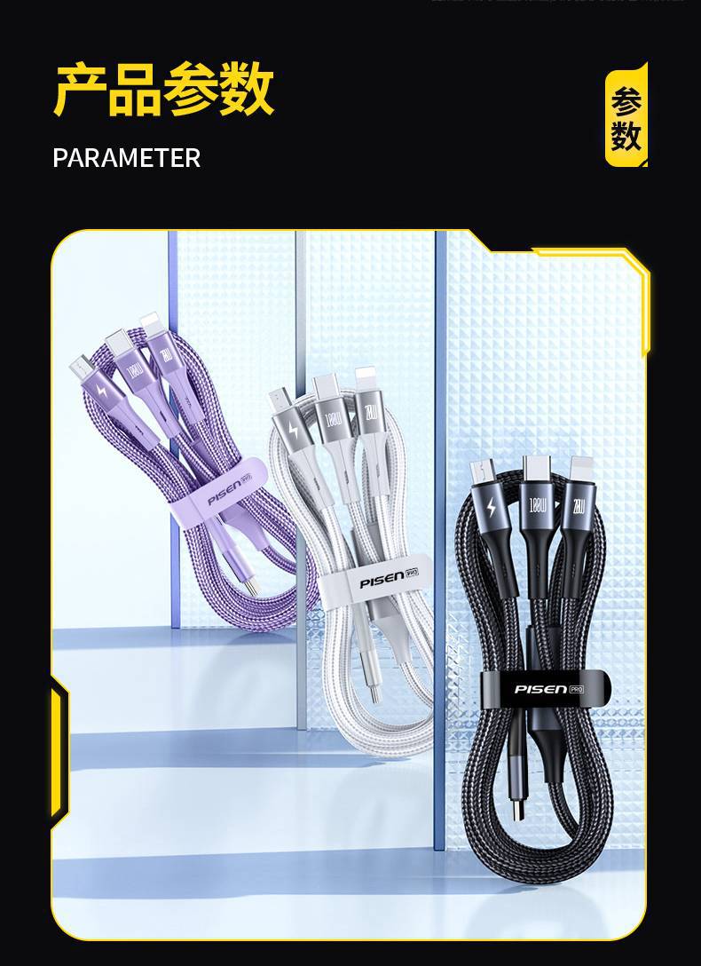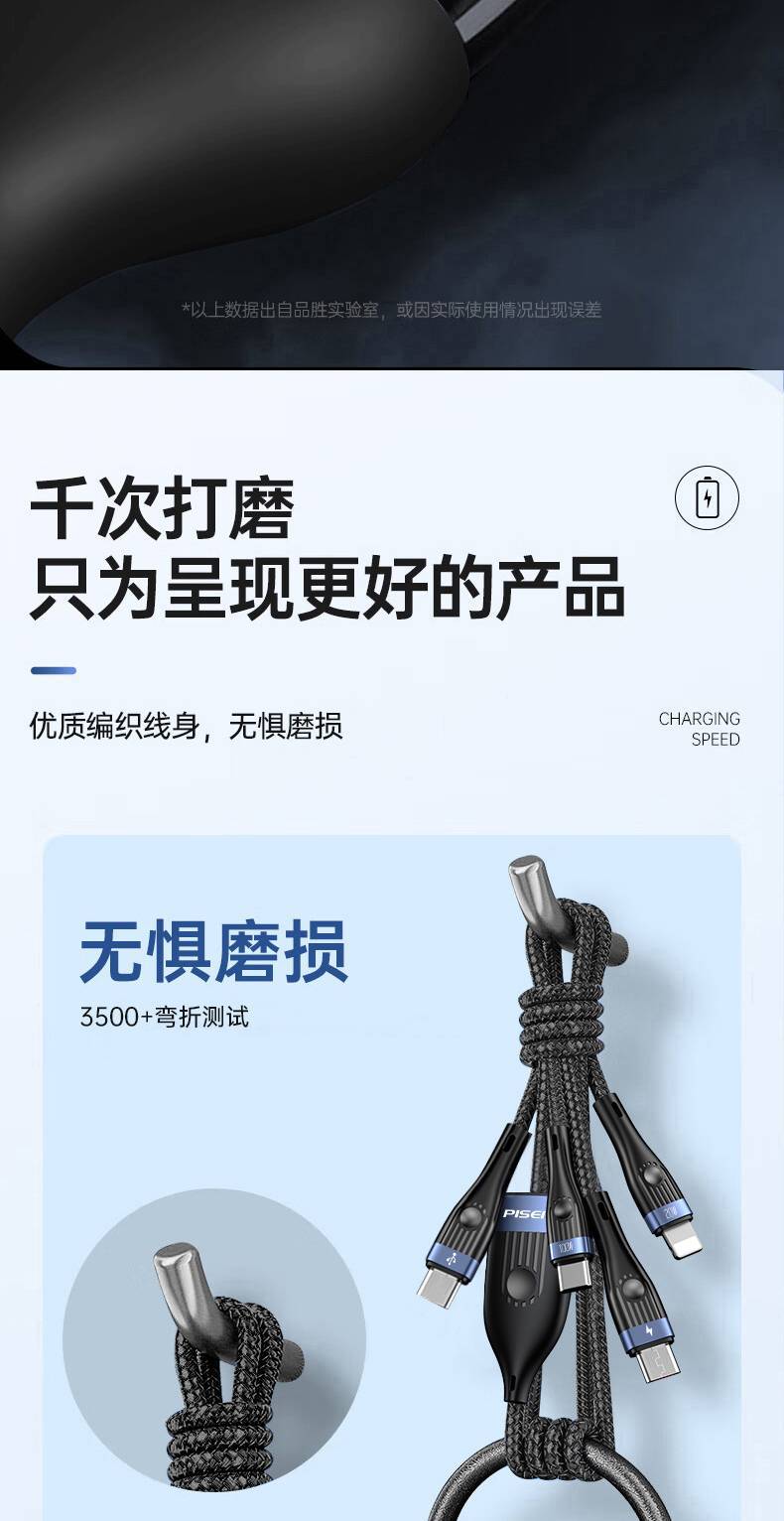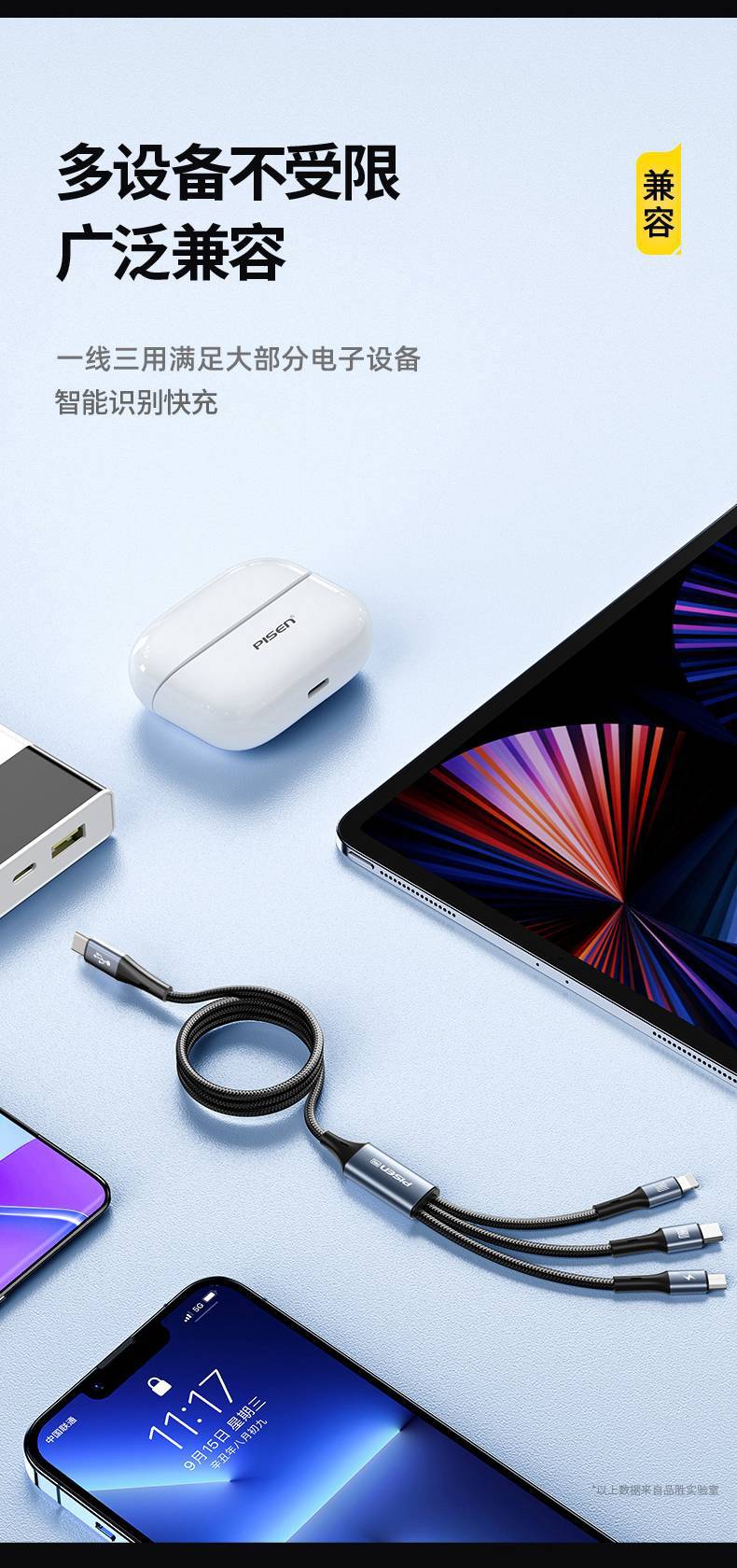 品勝type-c口一拖三數據線快充三合一100W適用蘋果華爲編織線