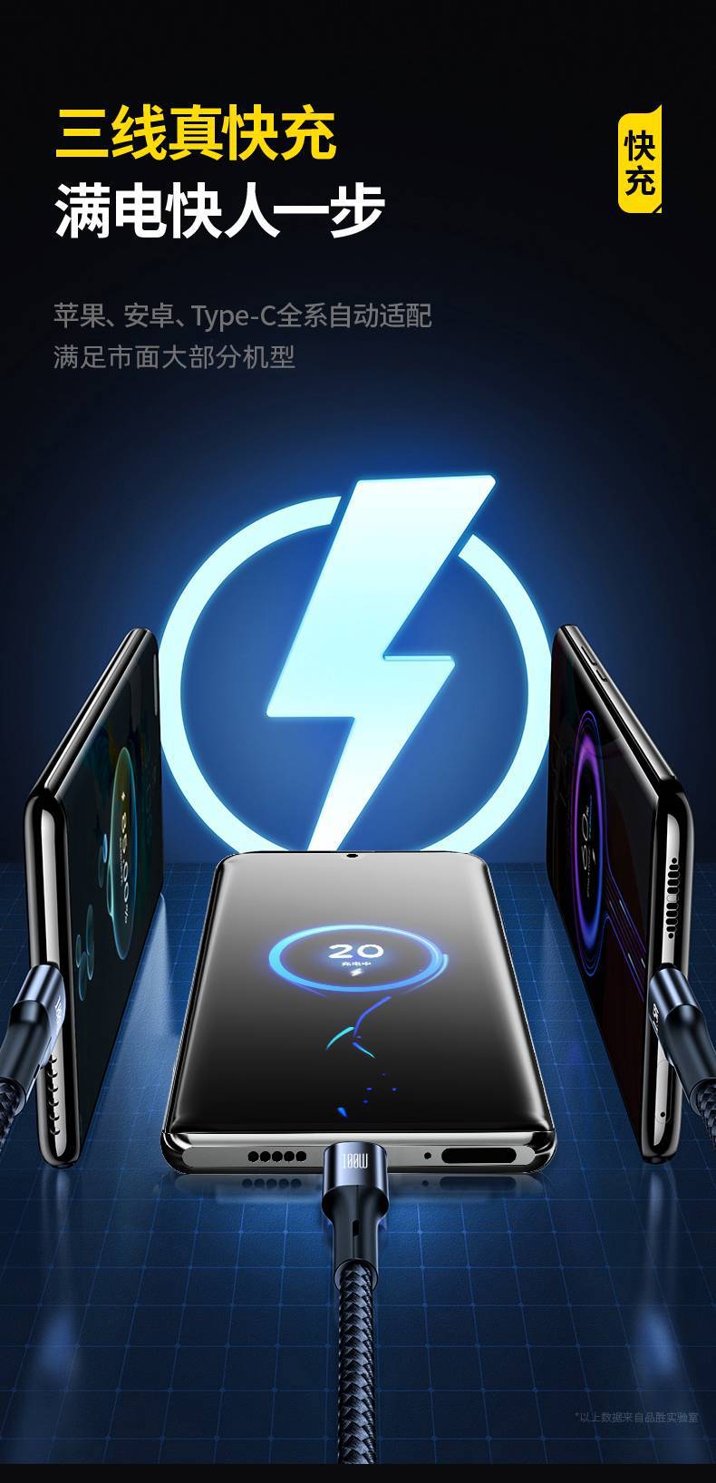 【100W超級快充】魔幻黑C轉三1.2米「適用蘋果+安卓+Type-C]*戰神系列