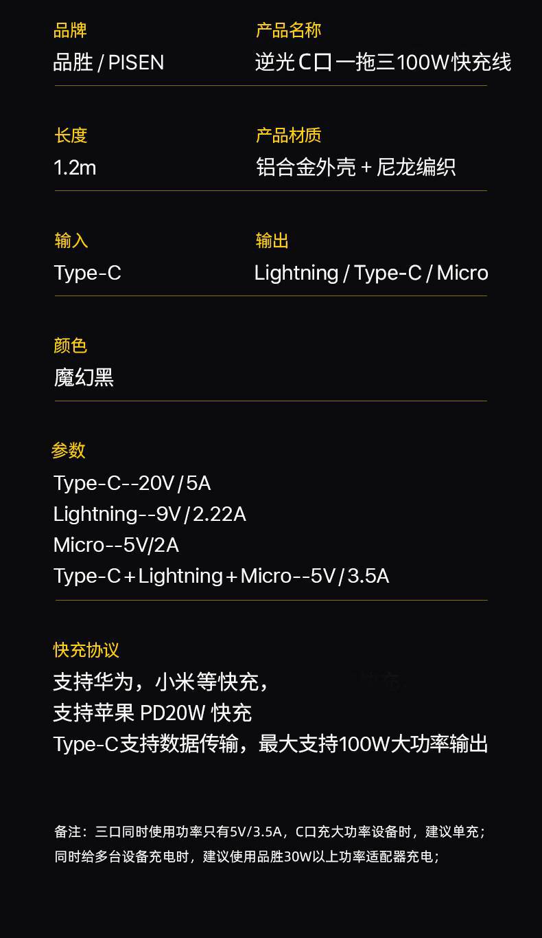 【100W超級快充】魔幻黑C轉三1.2米「適用蘋果+安卓+Type-C]*逆光系列