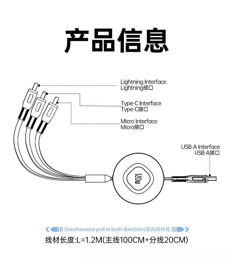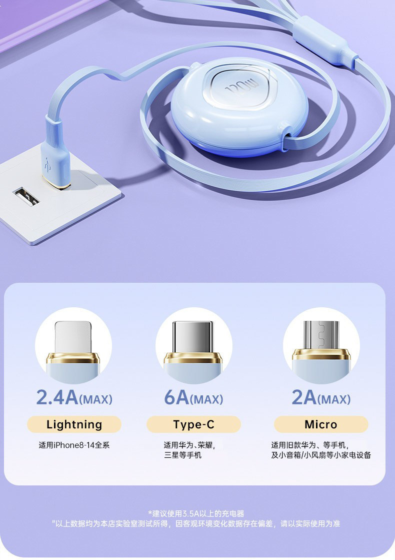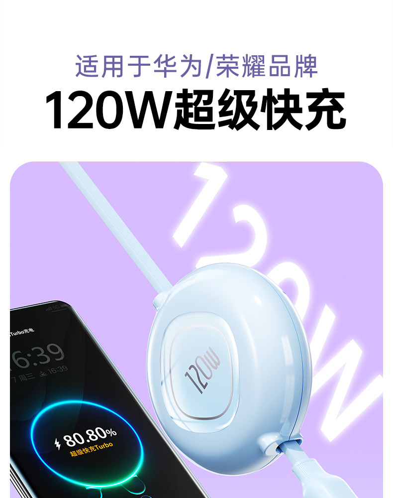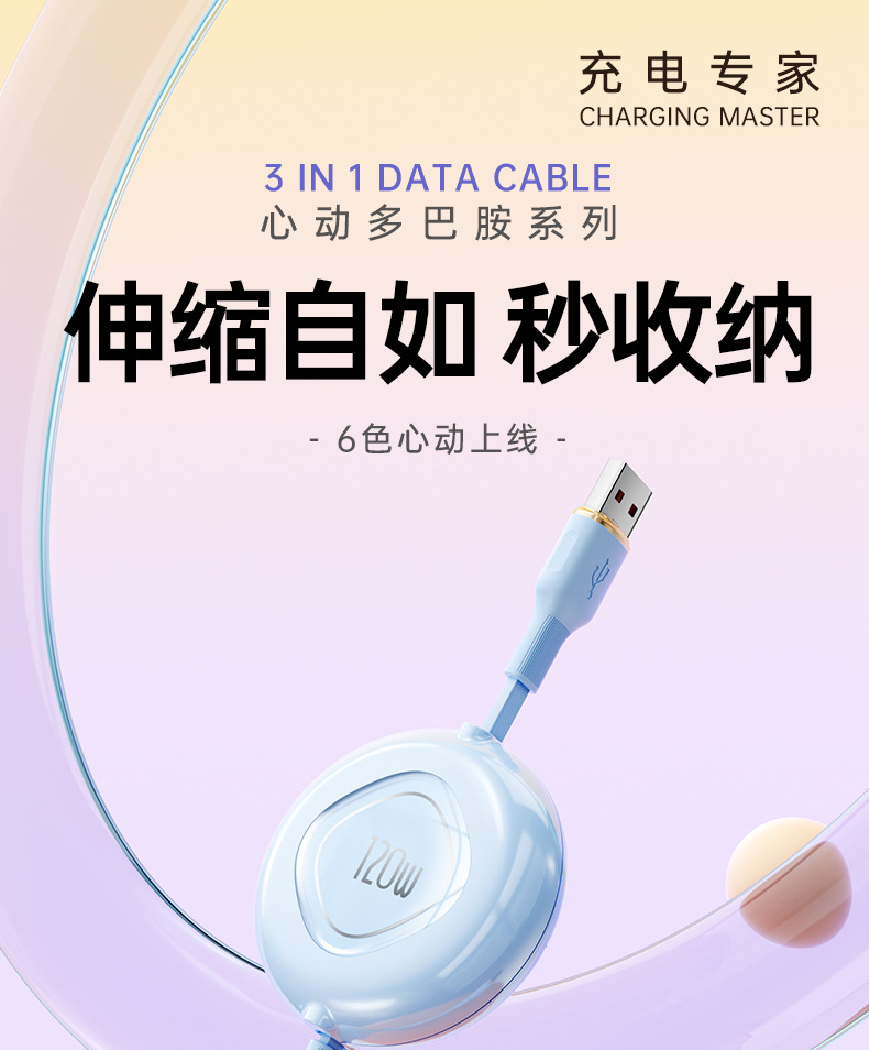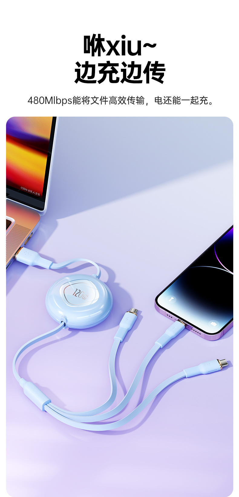 120W超級閃充伸縮充電線三合一多功能6A大容量數據線適用蘋果華爲