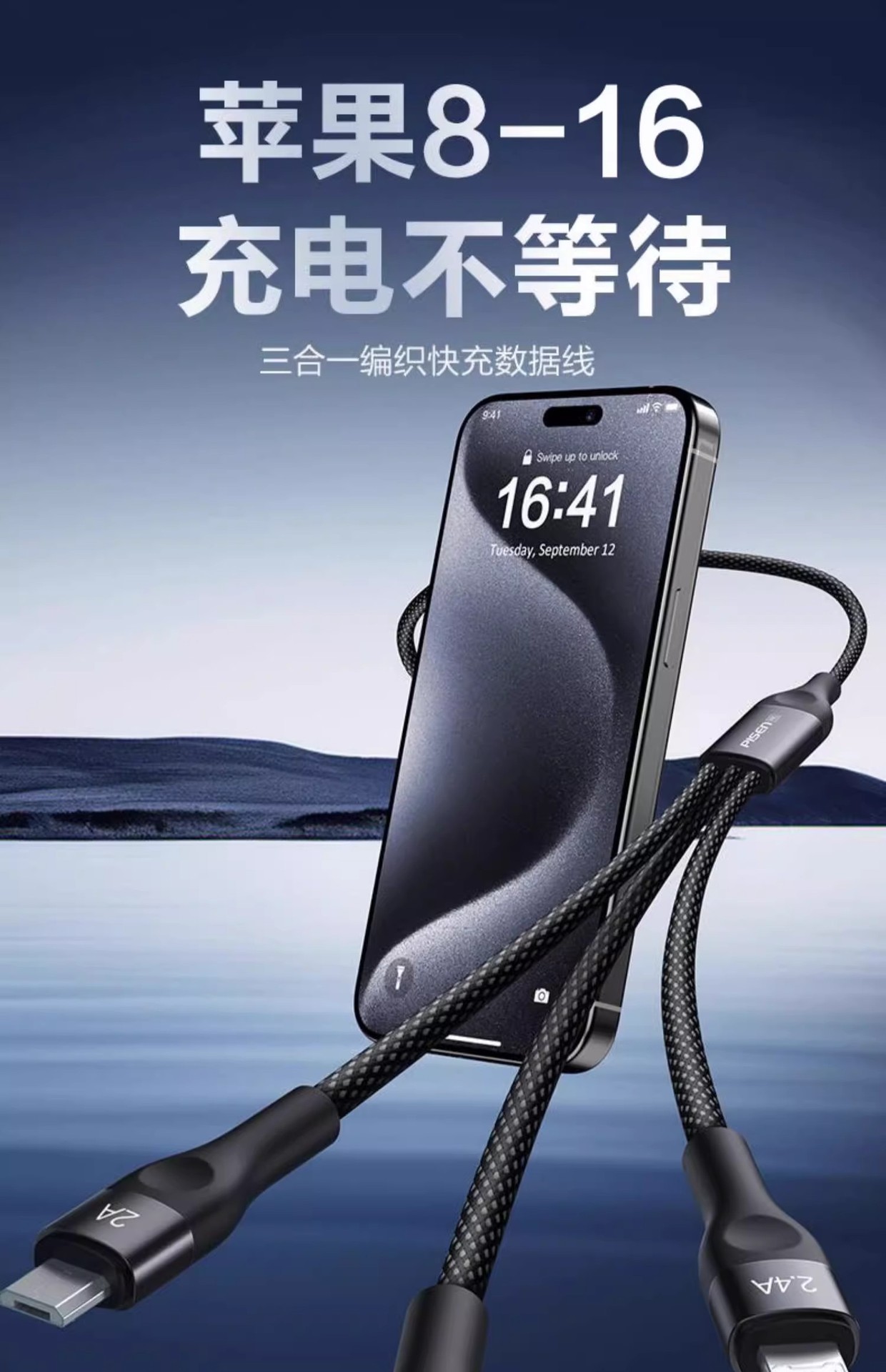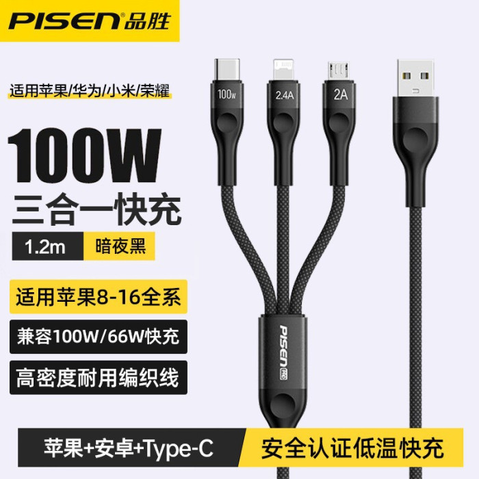品勝100W一拖三快充數據線三合一適用蘋果16promax多功能充電線15