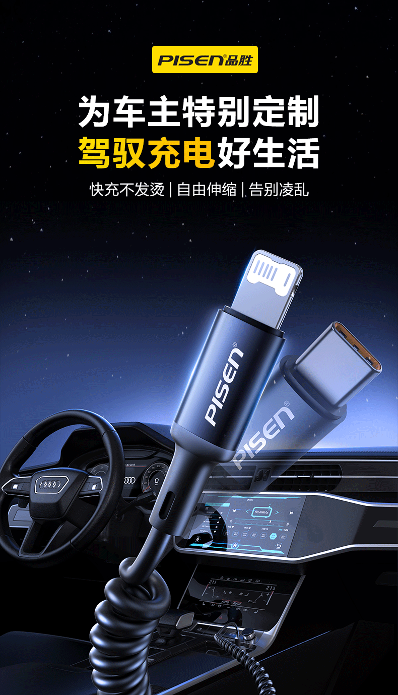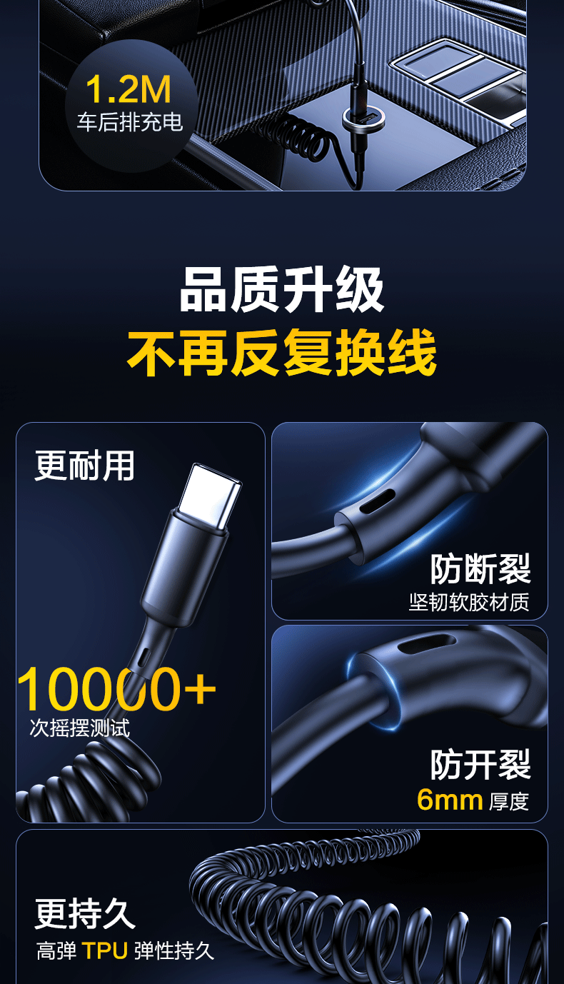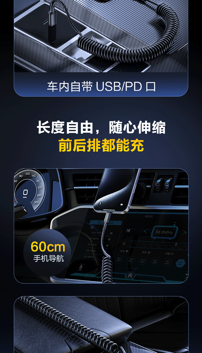 品勝車用彈簧數據快充線自由伸縮充電適用於蘋果全系列華爲小米等