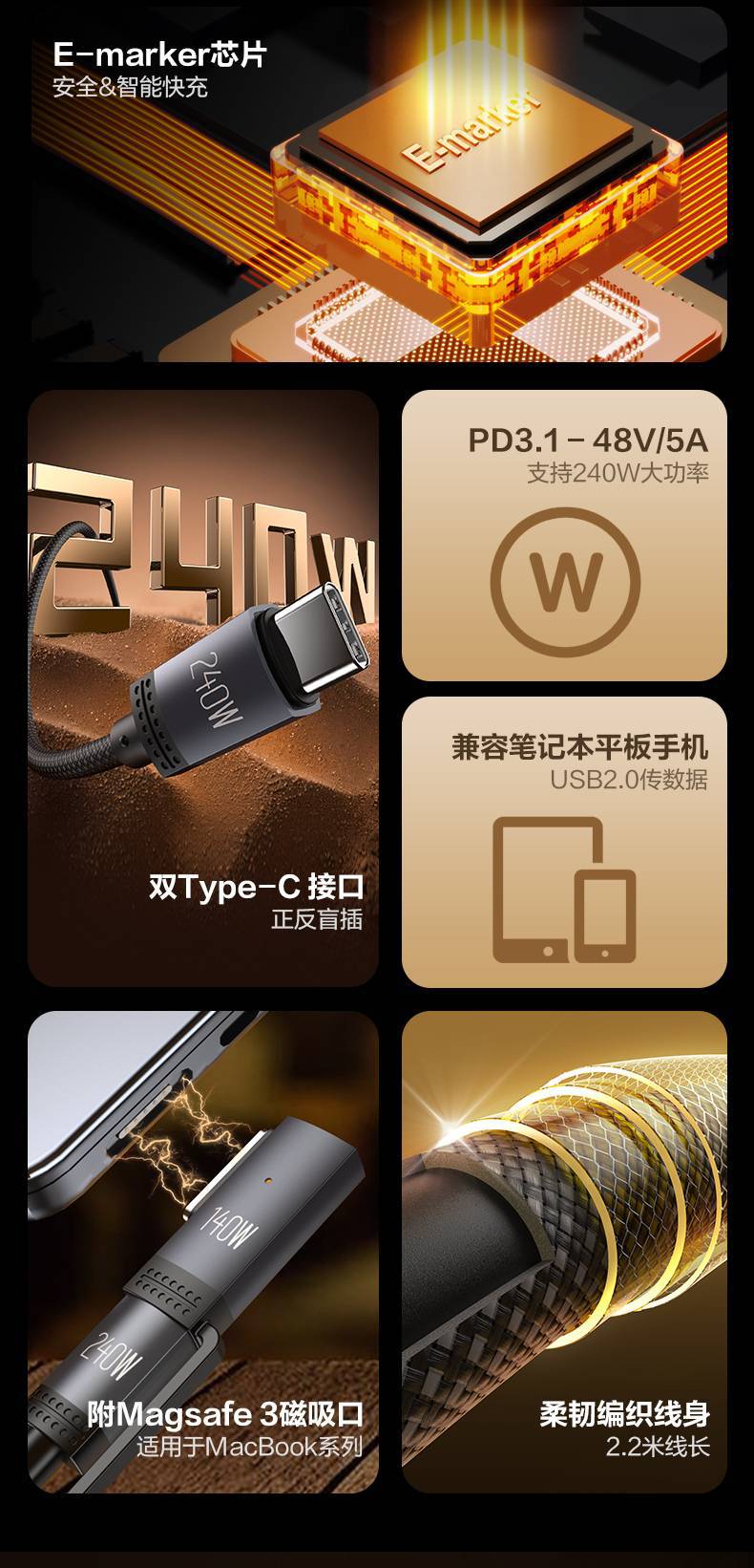 品勝二合一240W筆電數據充電線雙C適用蘋果華爲iPadPro平板快充