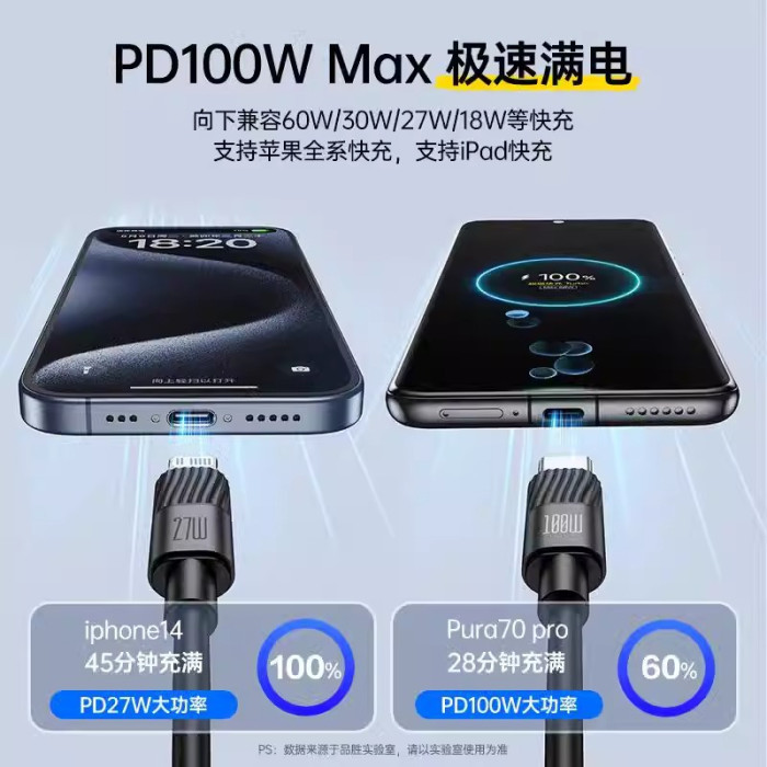 1.2m黑色【Typec+ip接口】100W快充丨支持蘋果8-16/安卓/筆記本/平板