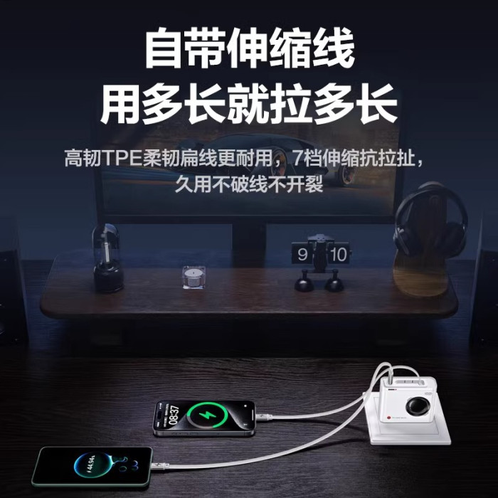 白色【Typec伸縮線】65W雙口氮化鎵快充丨筆記本/平板/手機通用