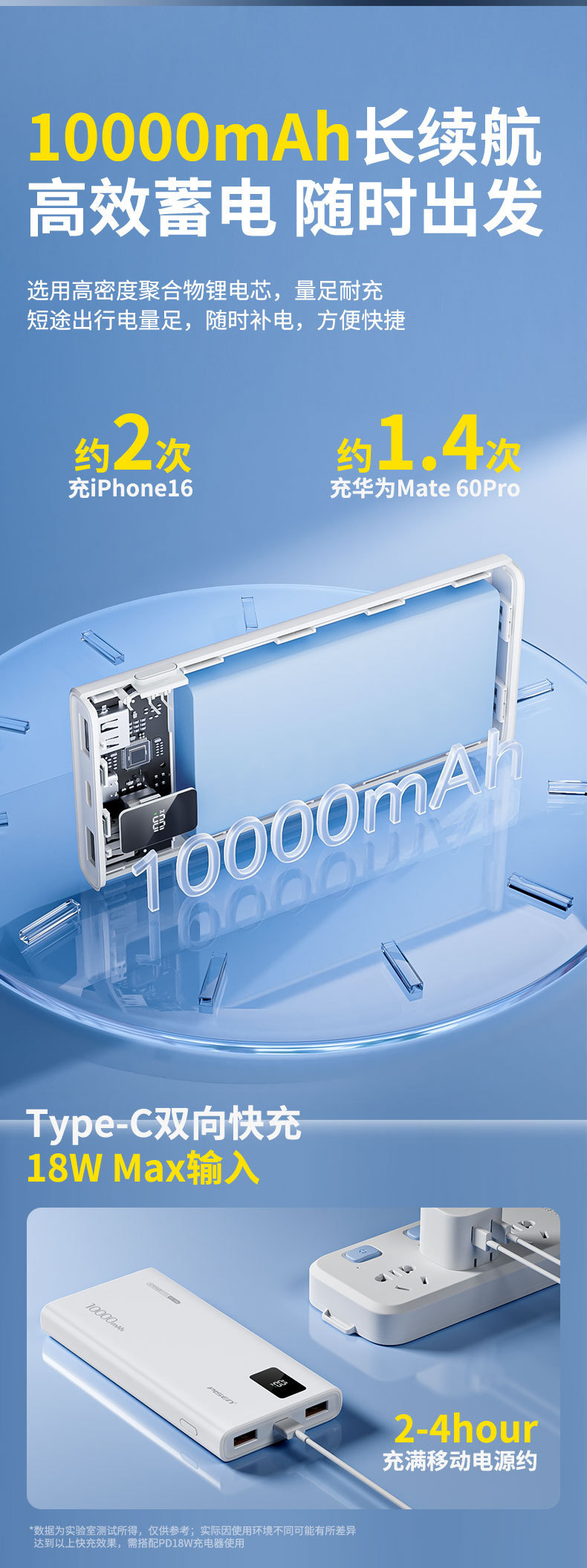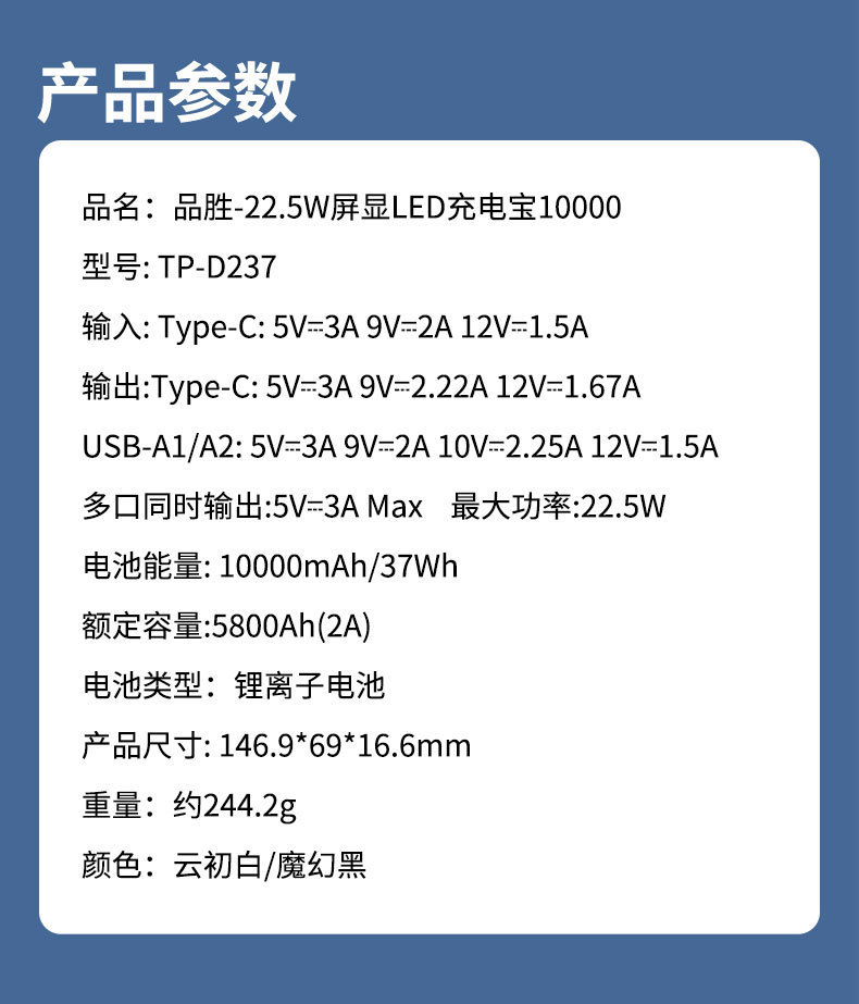 電源容量 | D237白色【22.5W屏顯LED充電寶10000】 |