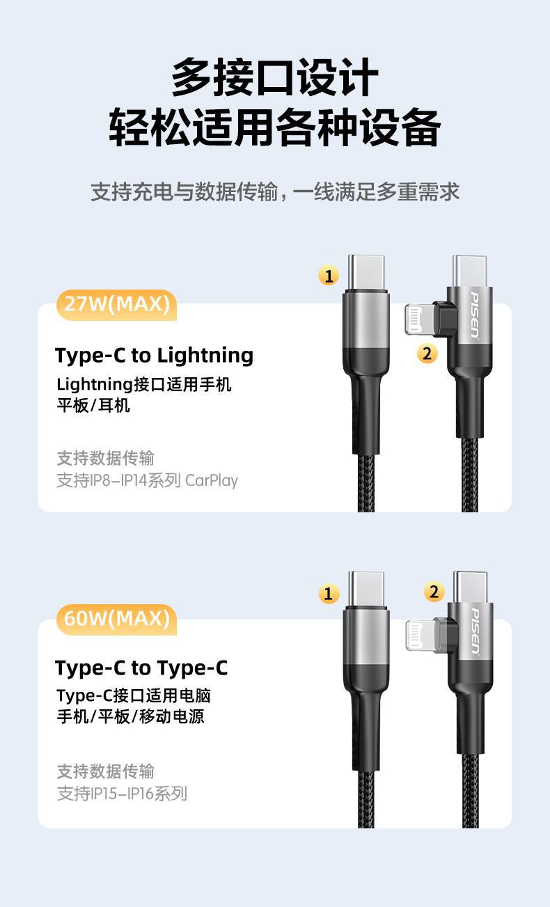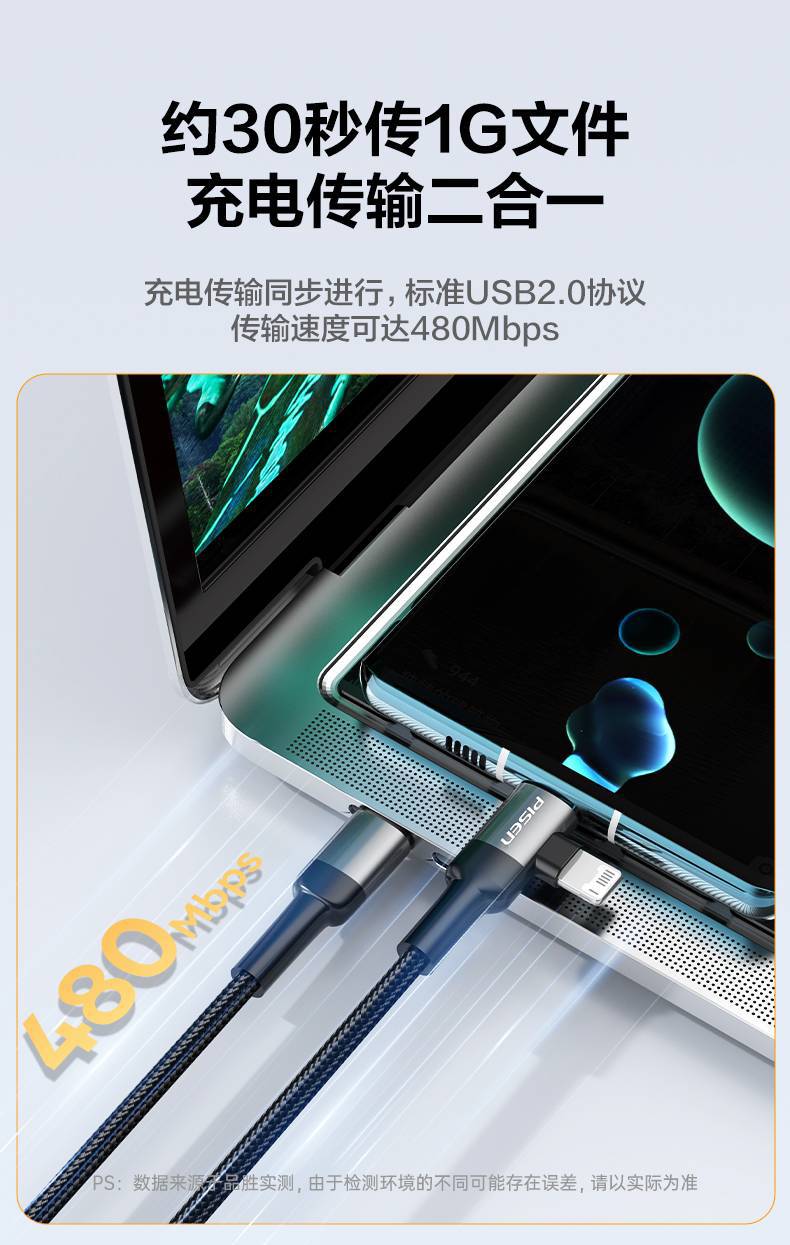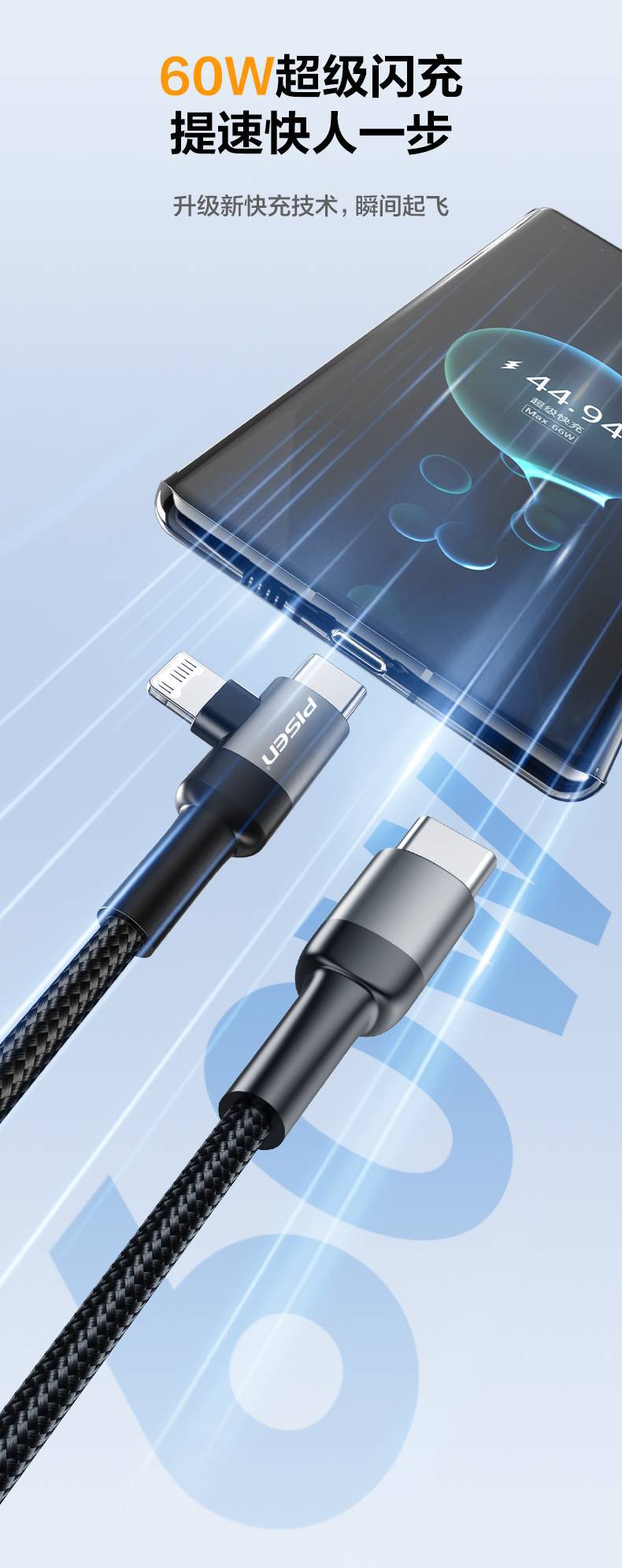 品勝 pd數據線適用蘋果iphone14快充鋁合金13快充線27w彎頭線60W