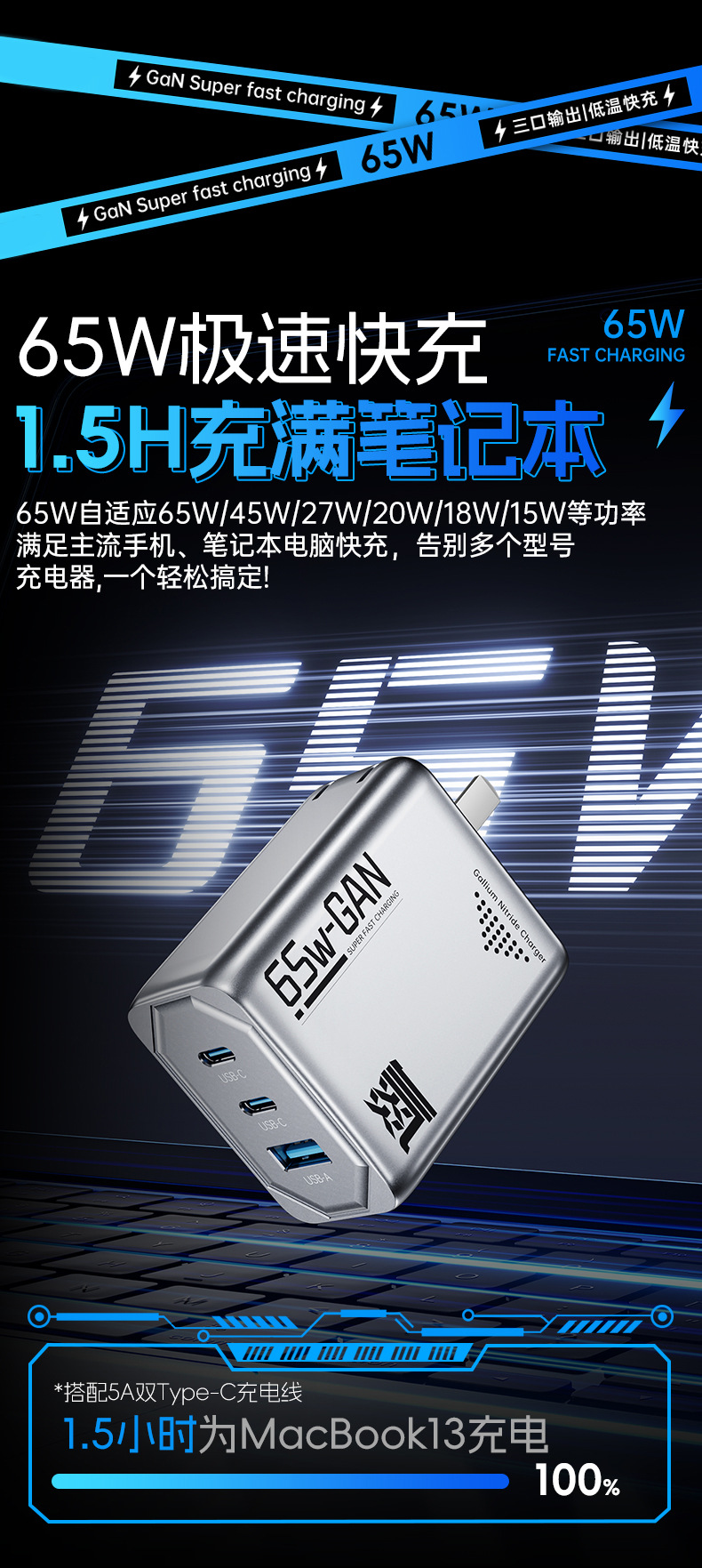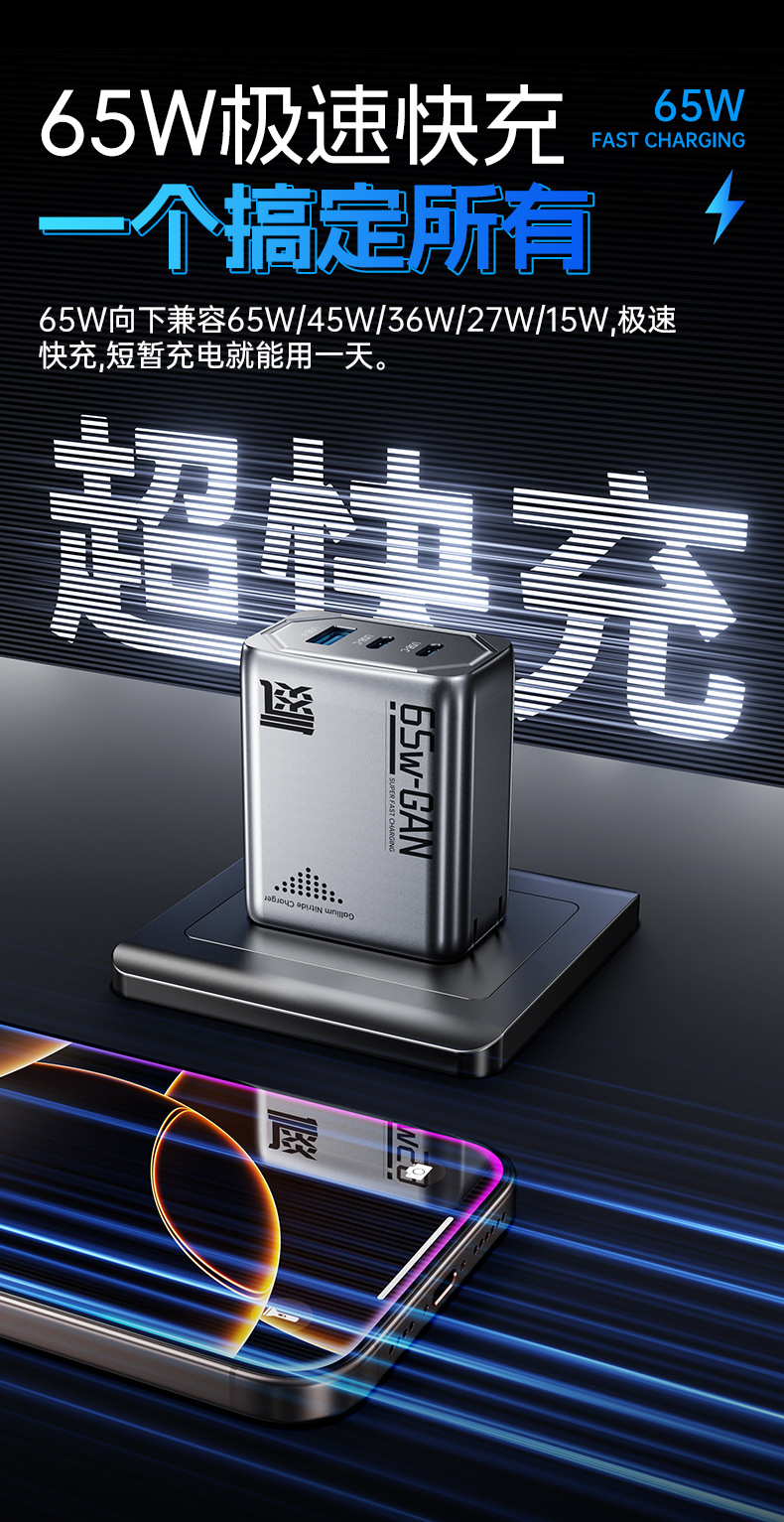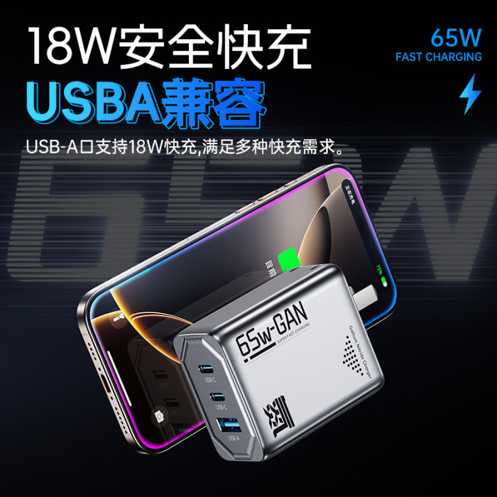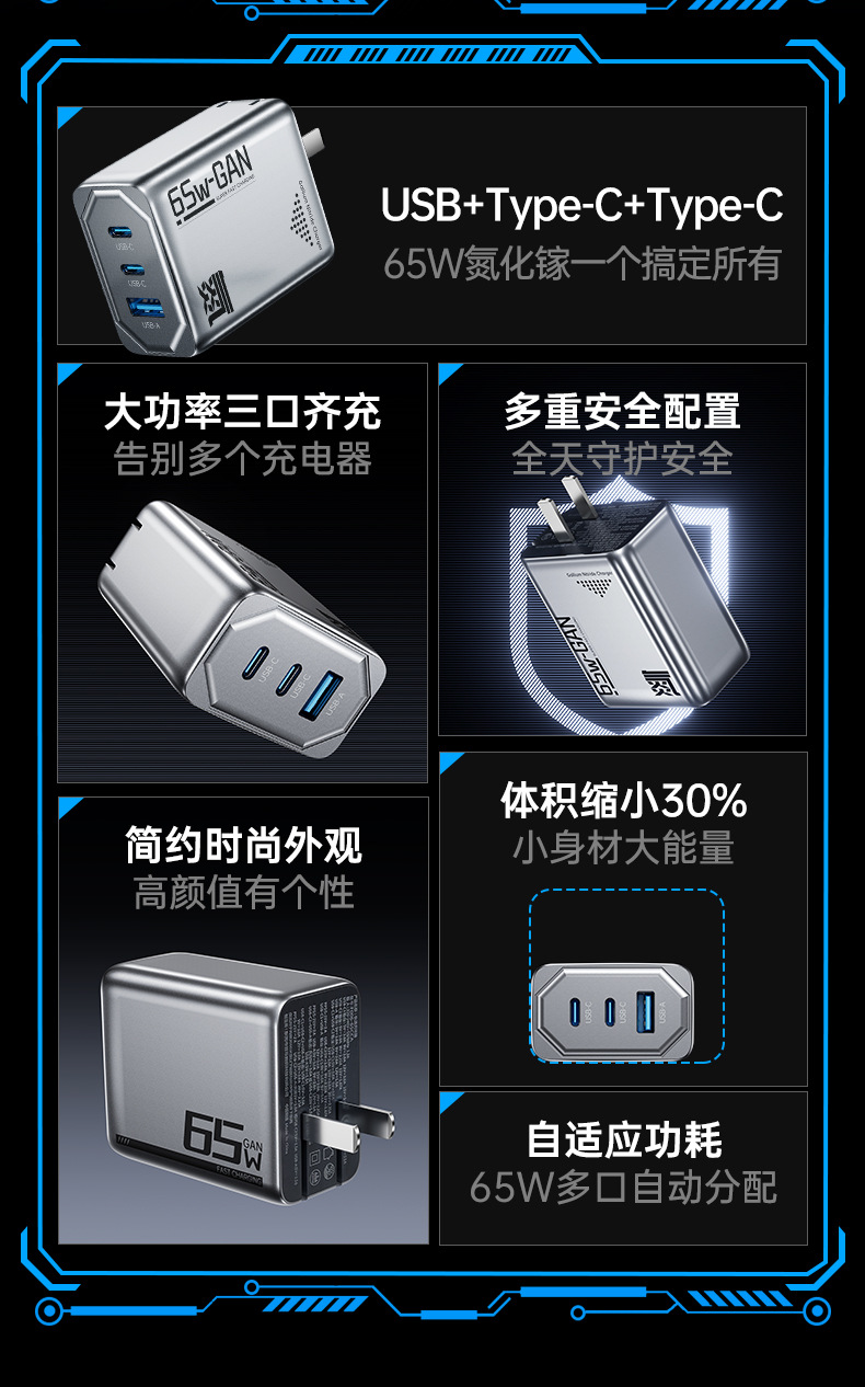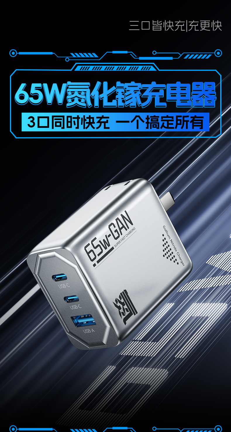 機甲風65W氮化鎵充電器PD三口快充頭折曡充電器適用筆電充電器