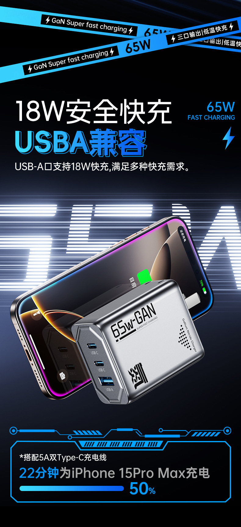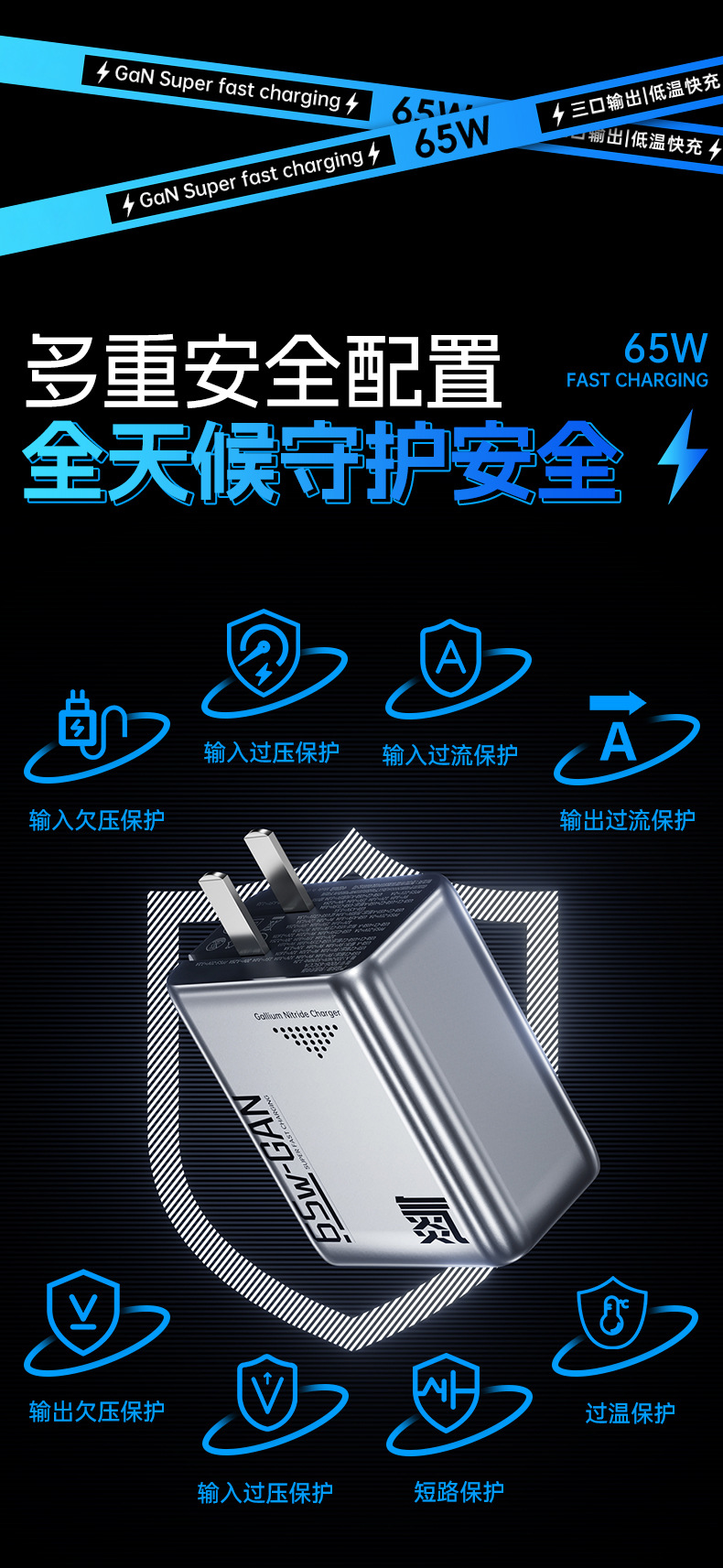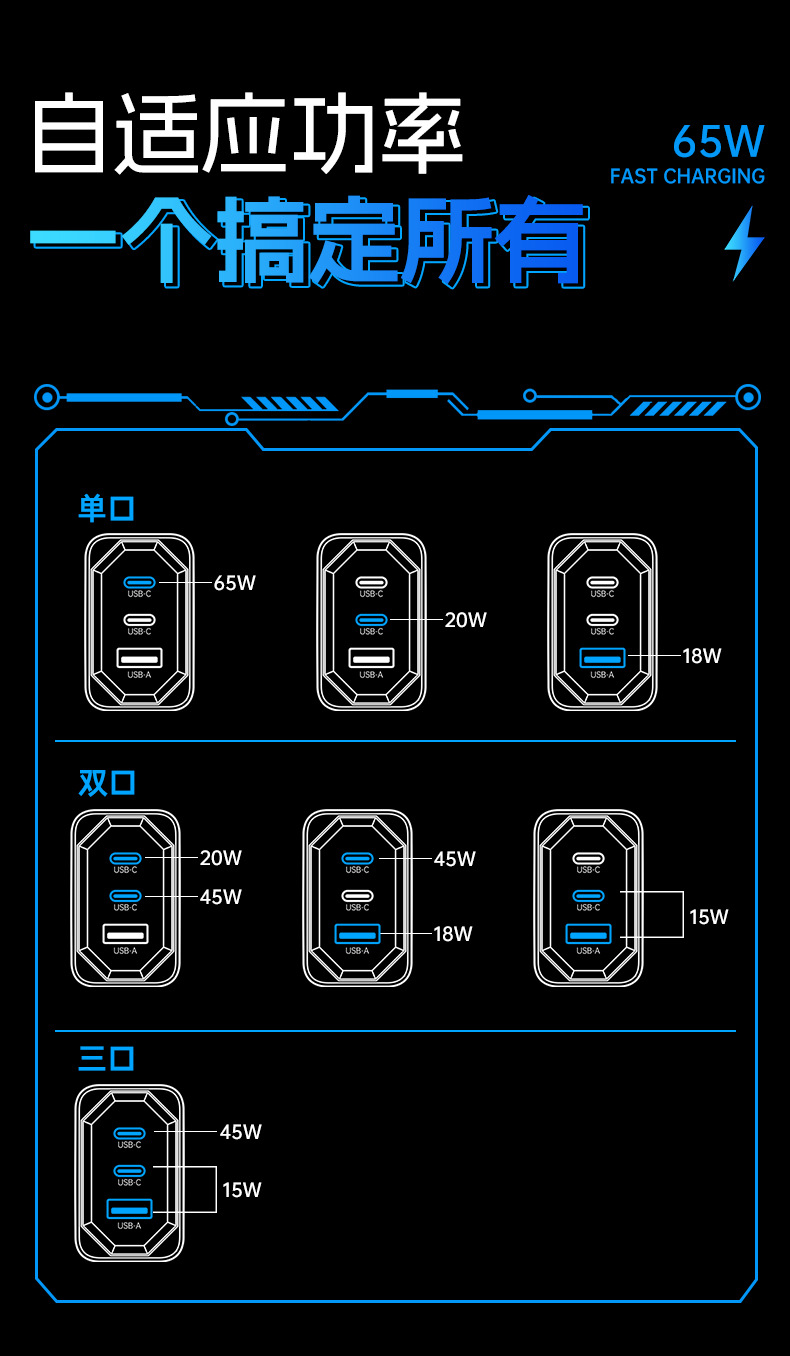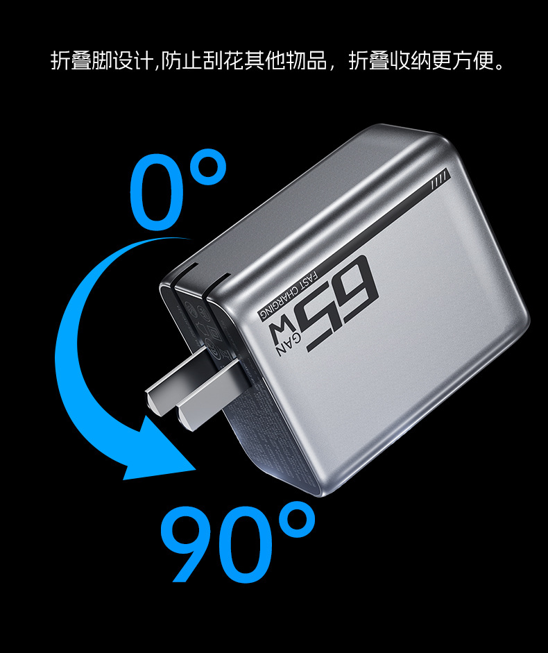 機甲風65W氮化鎵充電器PD三口快充頭折曡充電器適用筆電充電器
