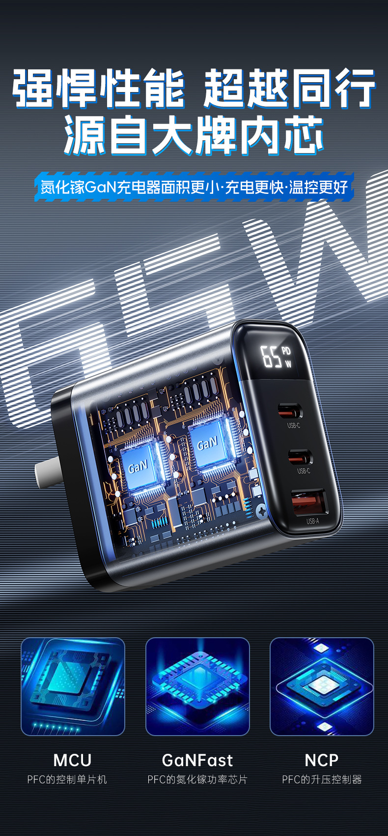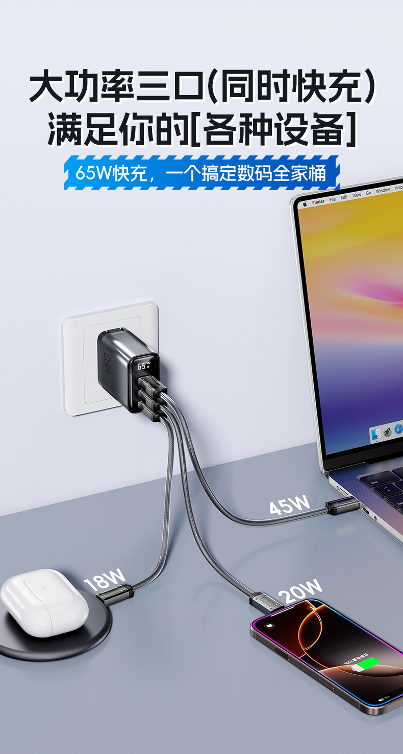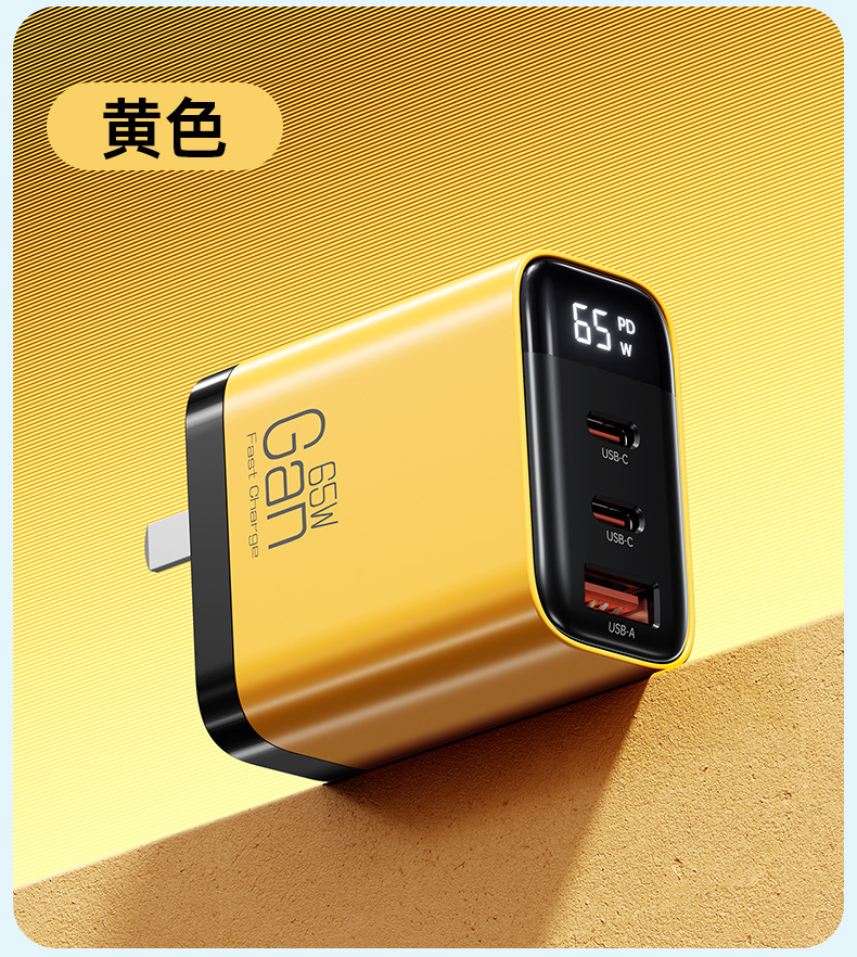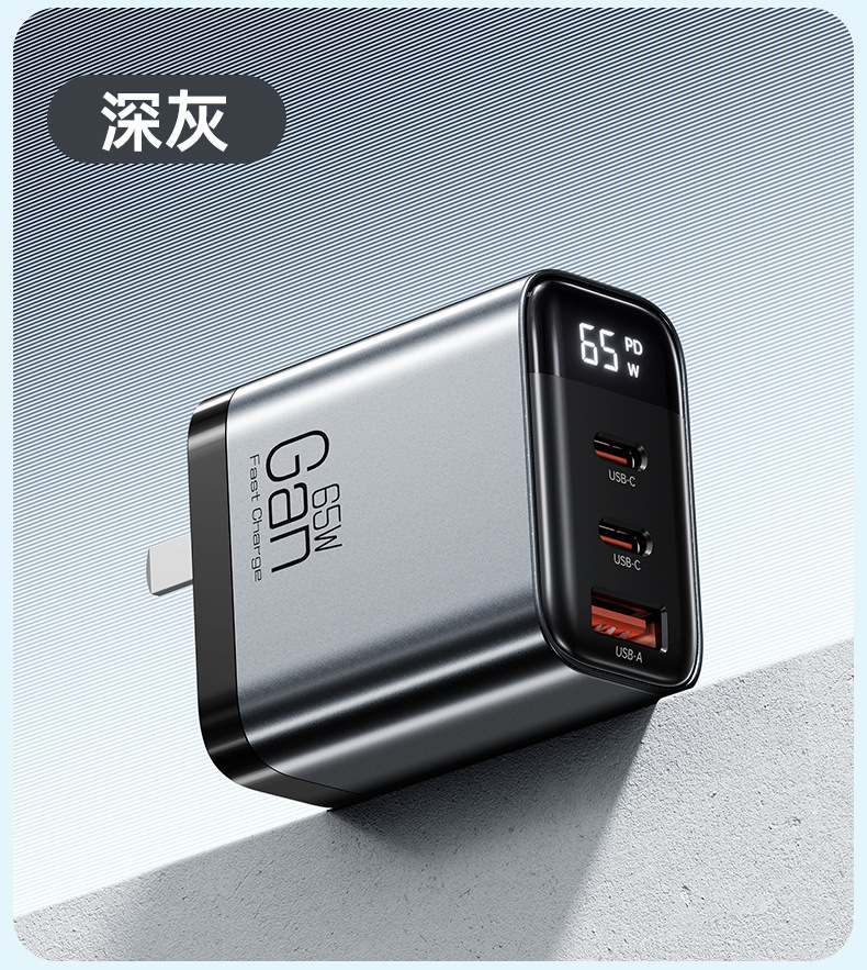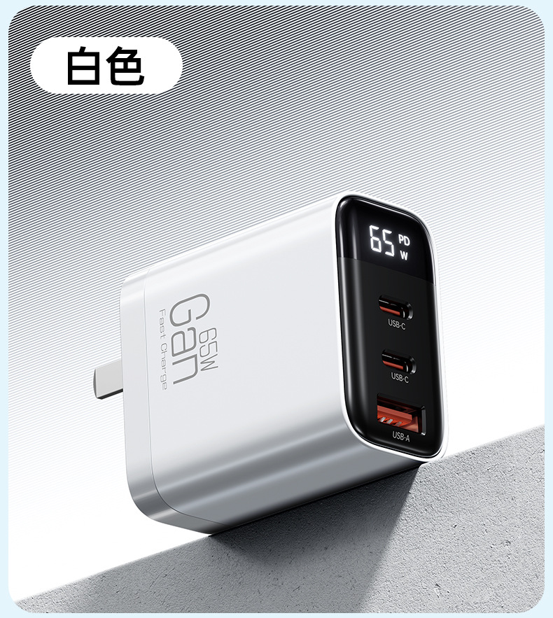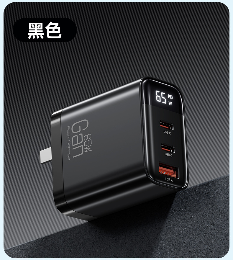 65W氮化鎵智能數顯三口GaN充電器PD多協議快充適用筆電手機平板