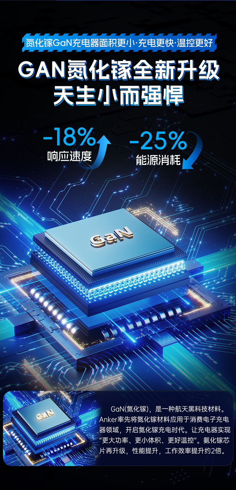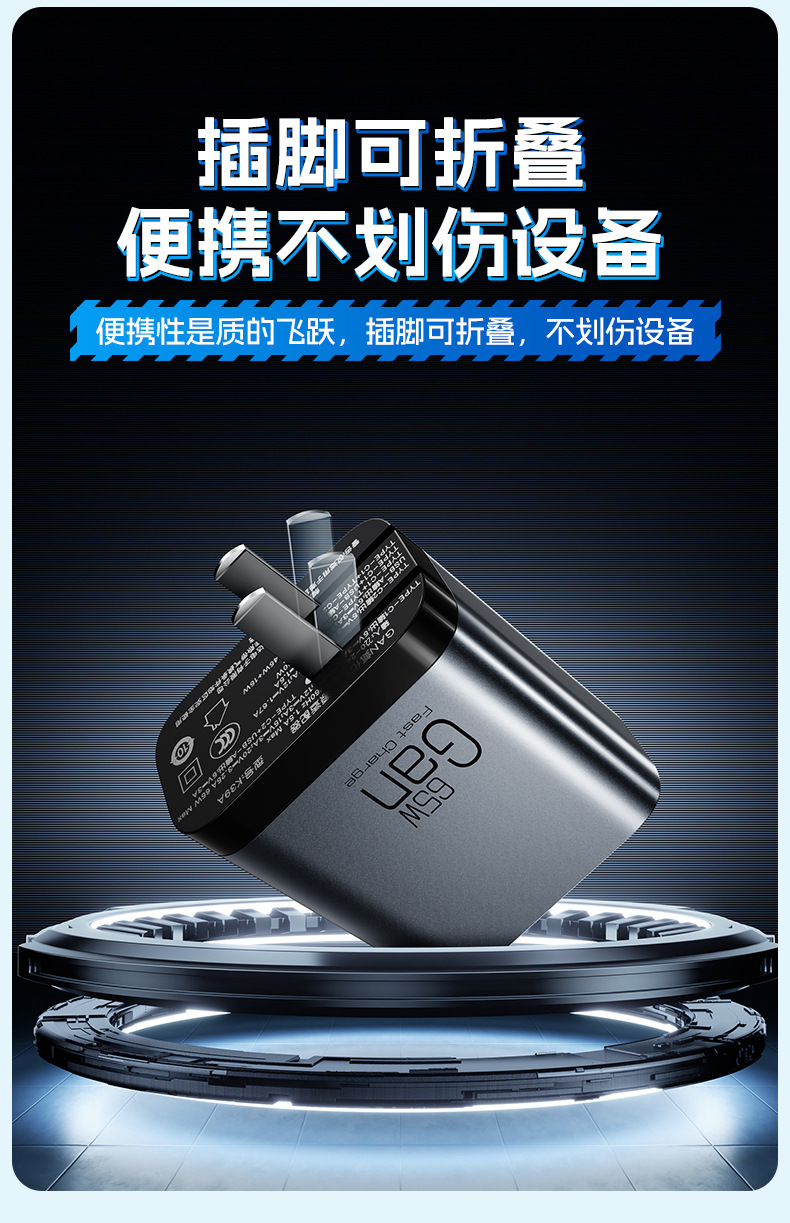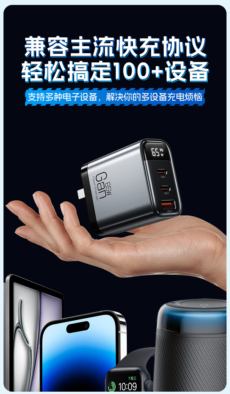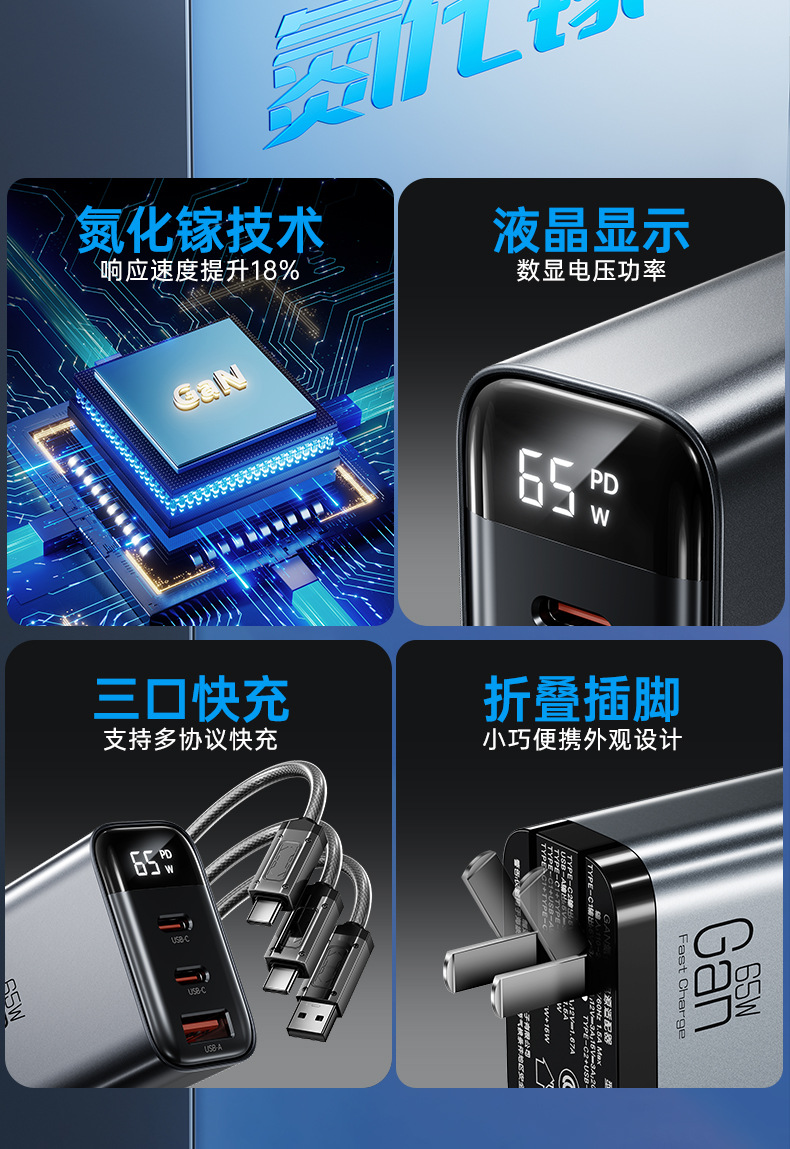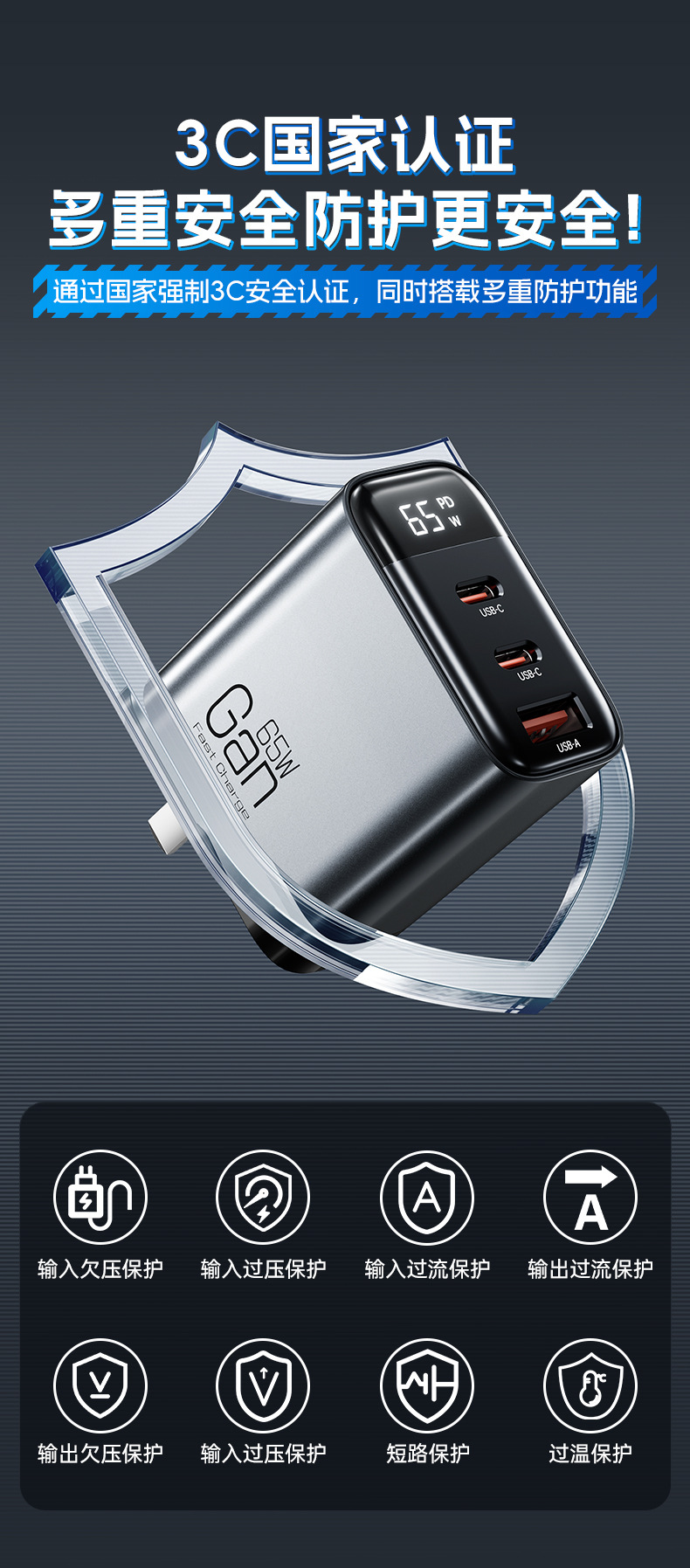 65W氮化鎵智能數顯三口GaN充電器PD多協議快充適用筆電手機平板