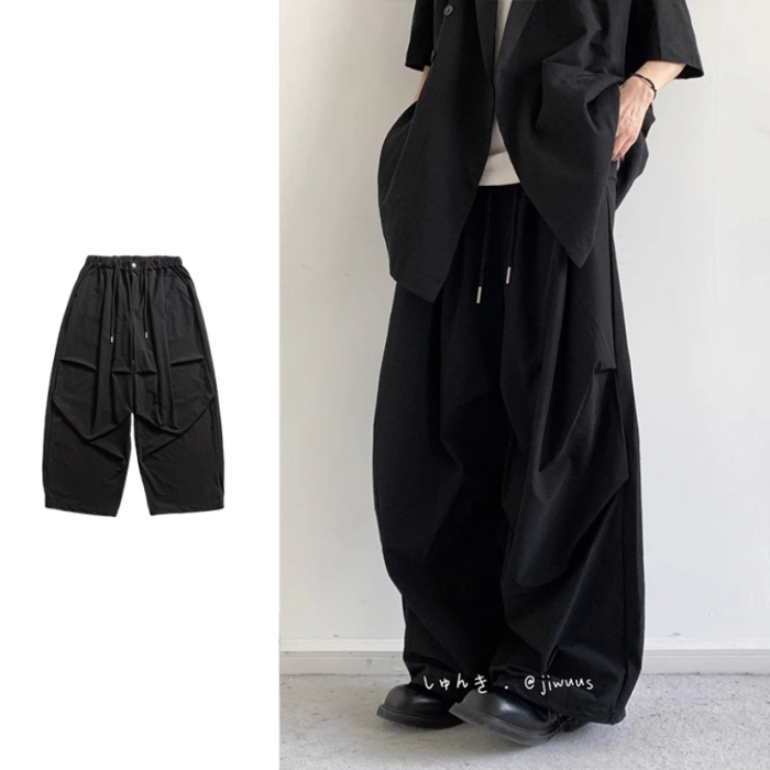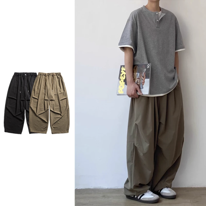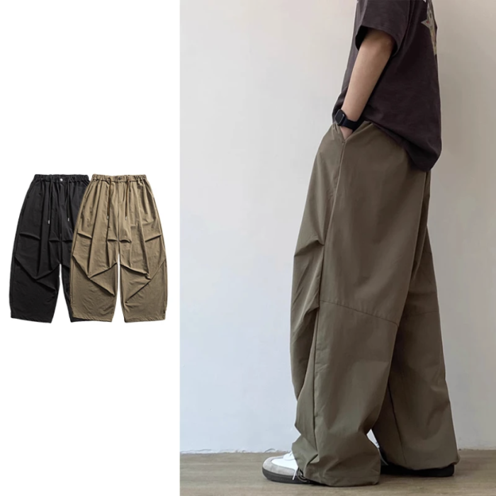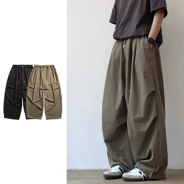 夏季日系復古純色寬松褶皺慵懶濶腿褲男女百搭直筒休閒繖兵長褲子