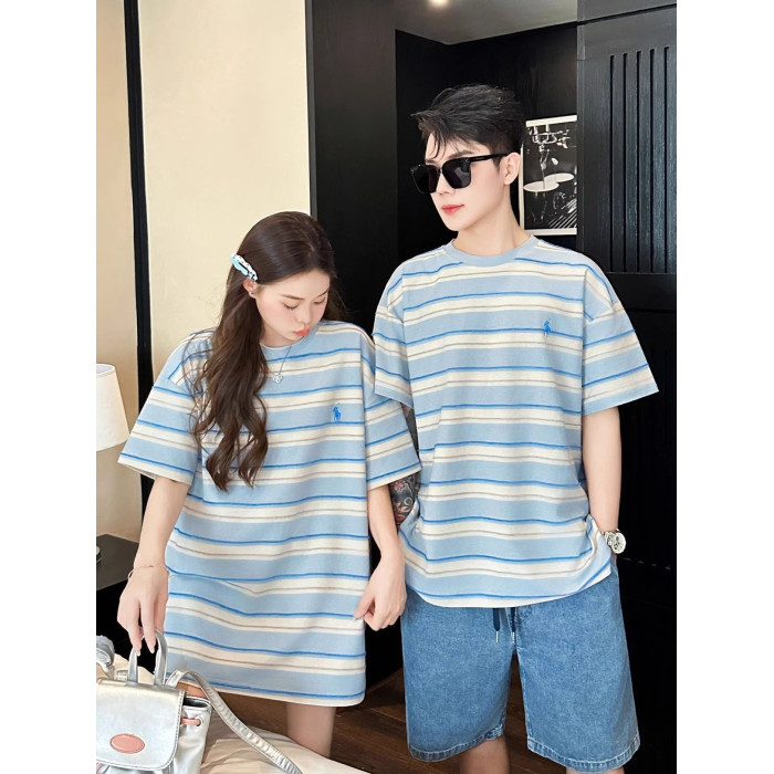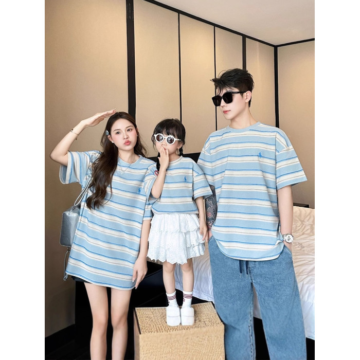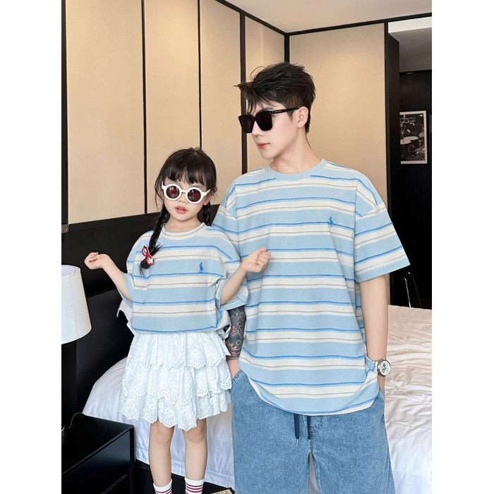 不一樣的小月齡親子裝2025新款高級一家三口母女嬰兒條紋短袖T恤