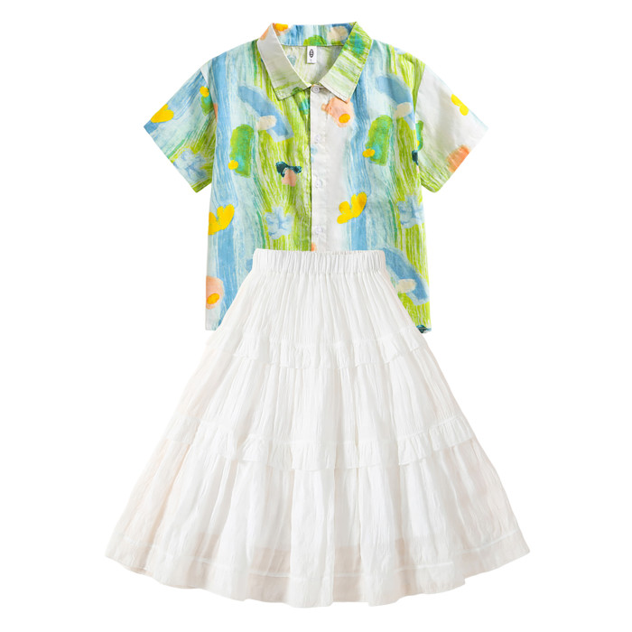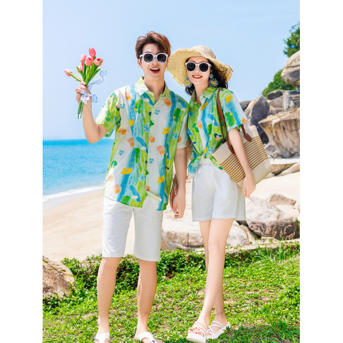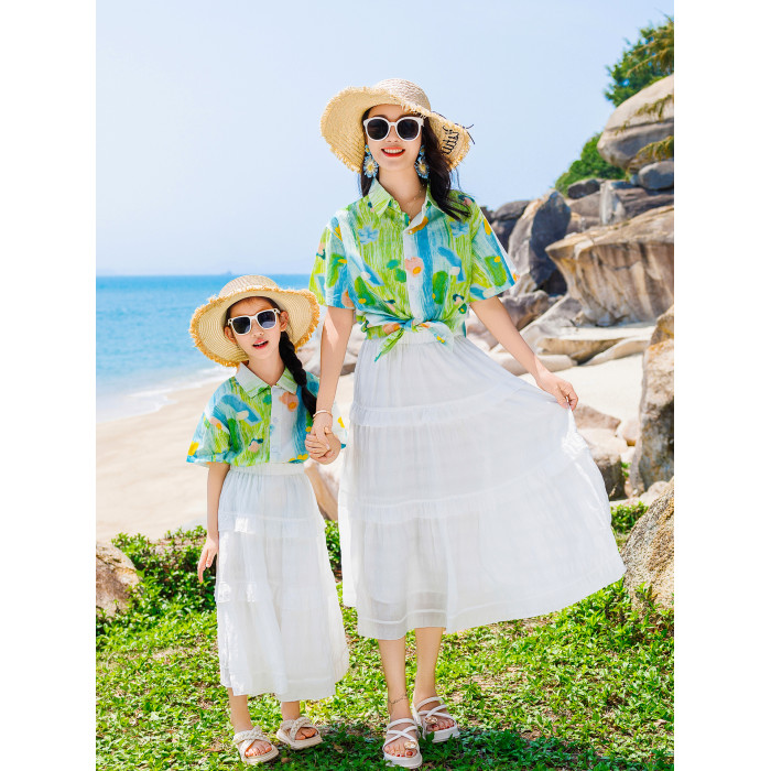 海邊度假親子裝一家三四口夏裝短袖襯衫小清新油畫母女母子沙灘裝