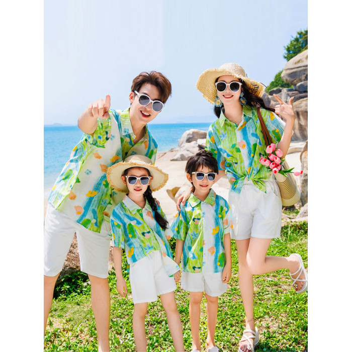 高級海邊度假親子裝短袖襯衫母女裝連衣裙一家三口夏季新款沙灘裙