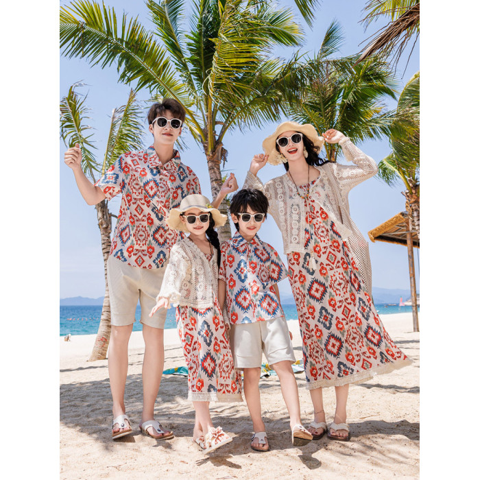 親子裝一家三口四口波西米亞母女連衣裙海邊沙灘度假襯衫套裝夏季