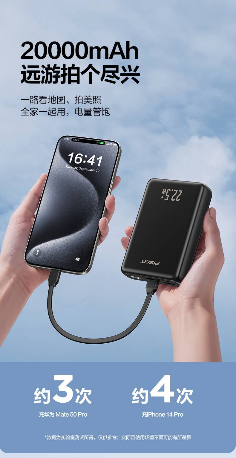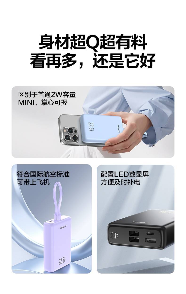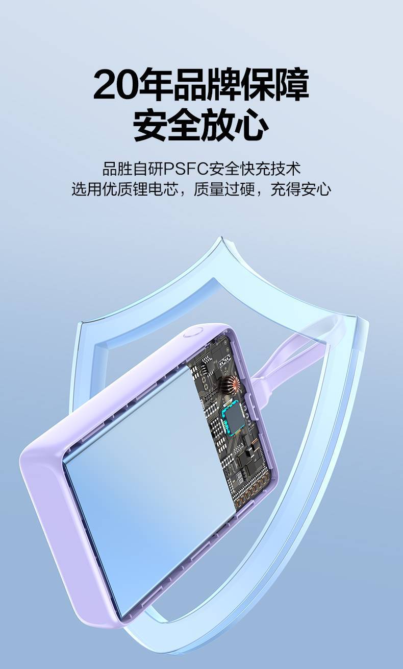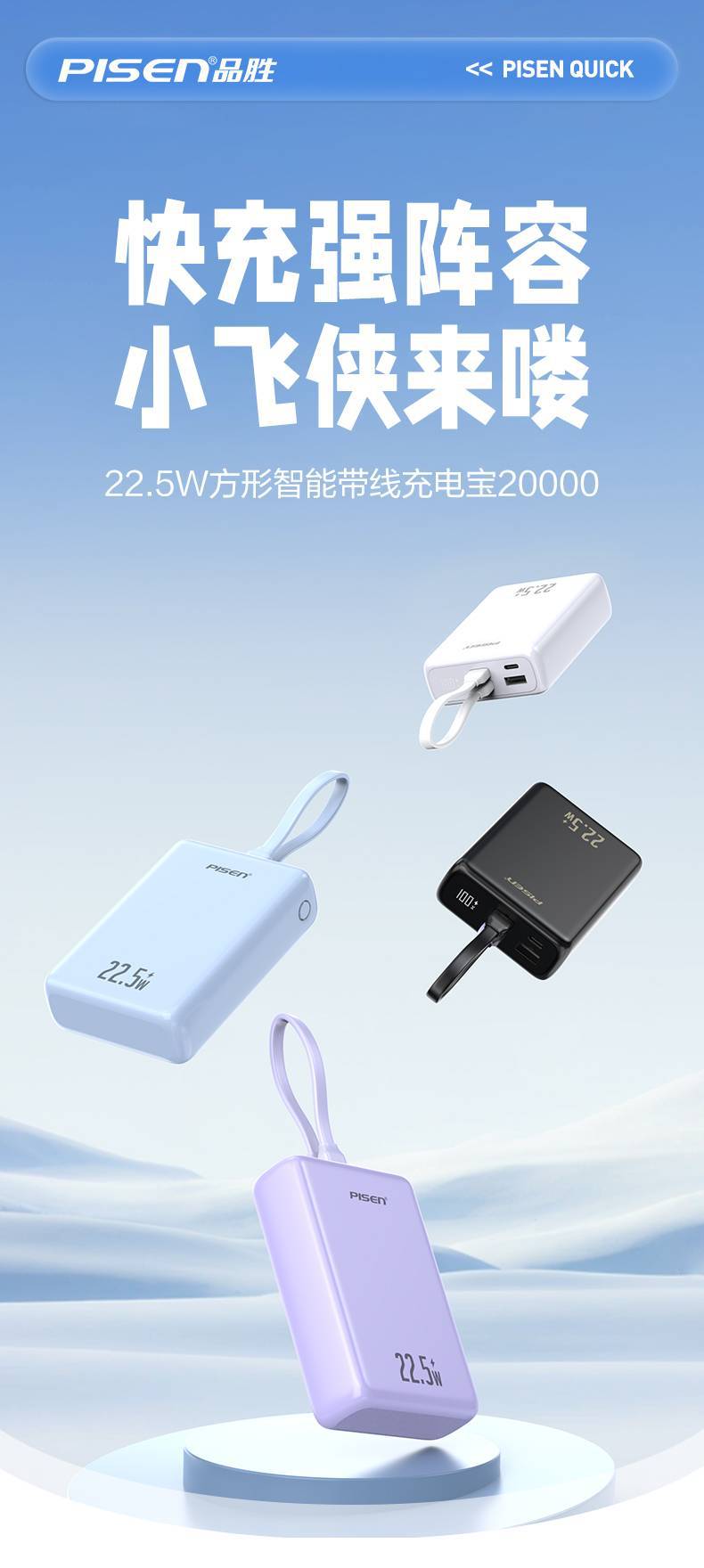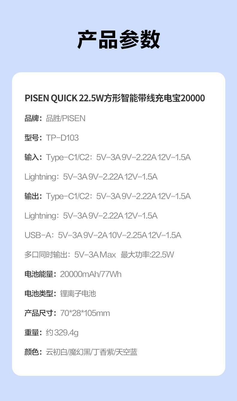 電源容量 | 丁香紫*22.5W方形智能帶線充電寶20000 |