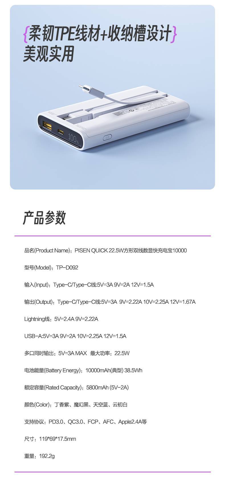 電源容量 | 10000毫安 |