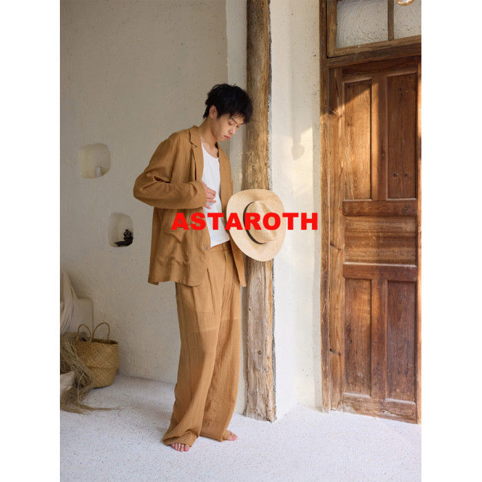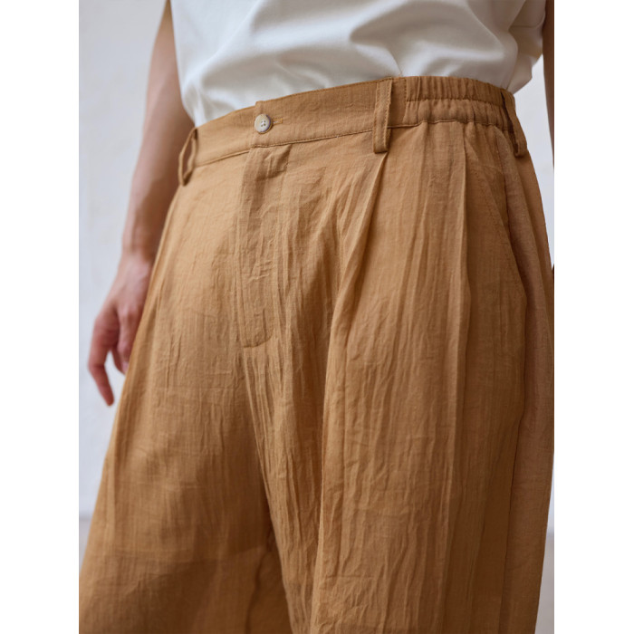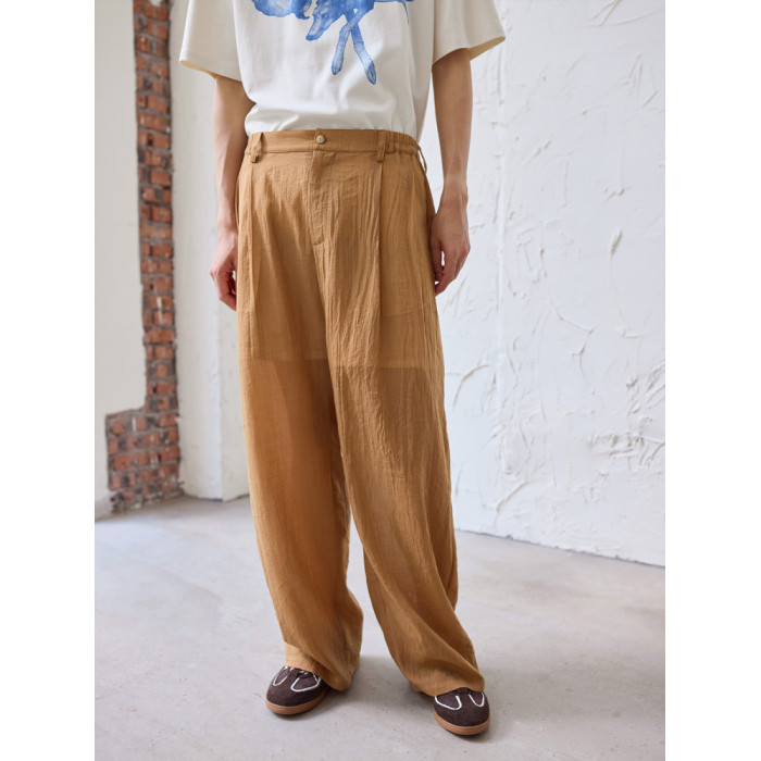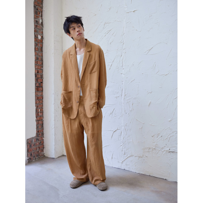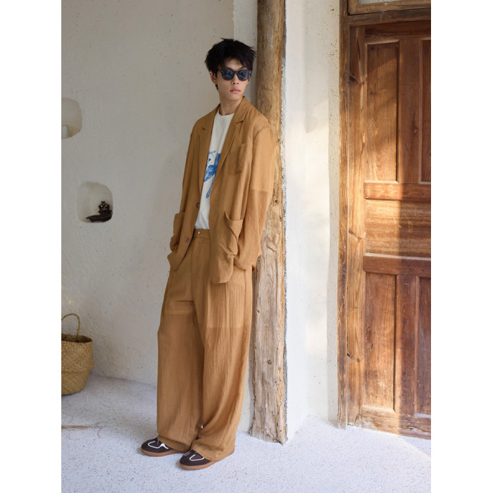 原創設計師休閒長褲男夏輕薄直筒濶腿褲寬松垂感棉質復古褶皺肌理