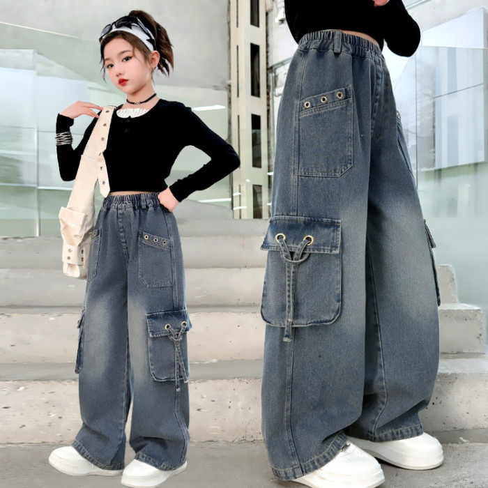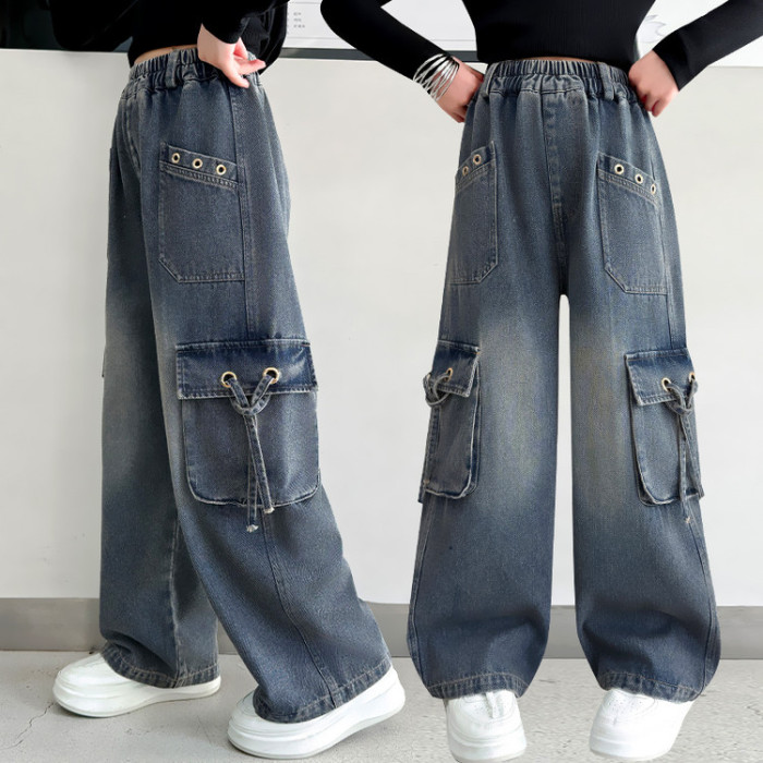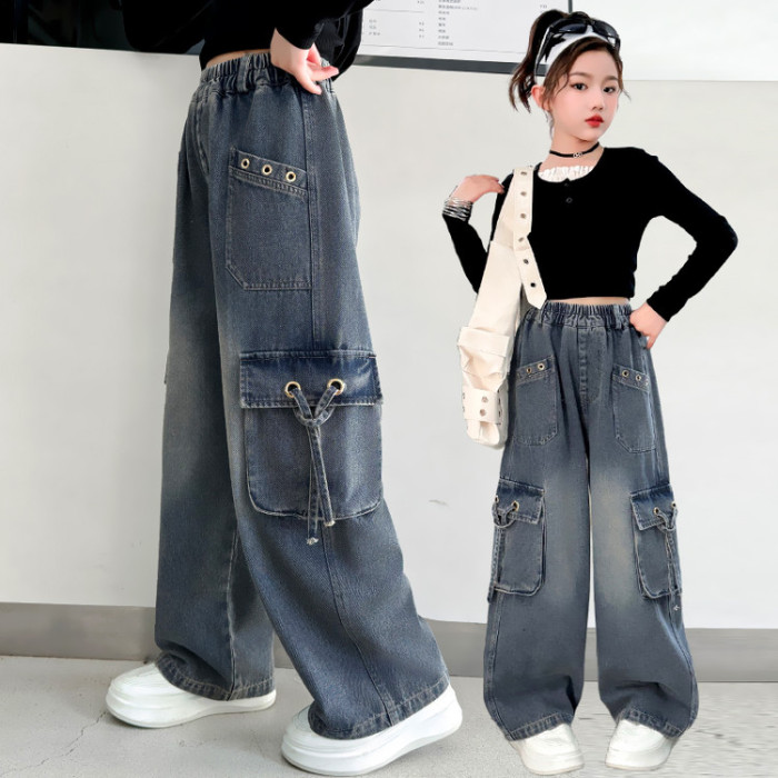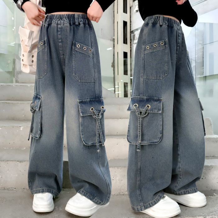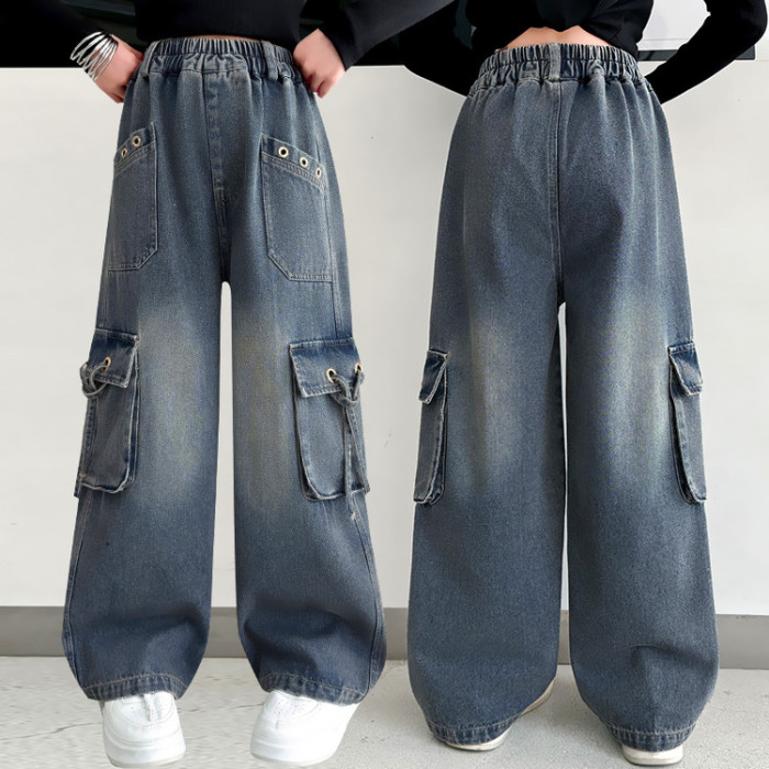 女童工裝褲春秋女大童春款牛仔褲潮酷寬松濶腿褲休閒春季兒童褲子