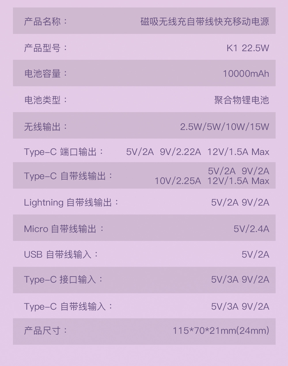 電源容量 | 10000毫安 |
