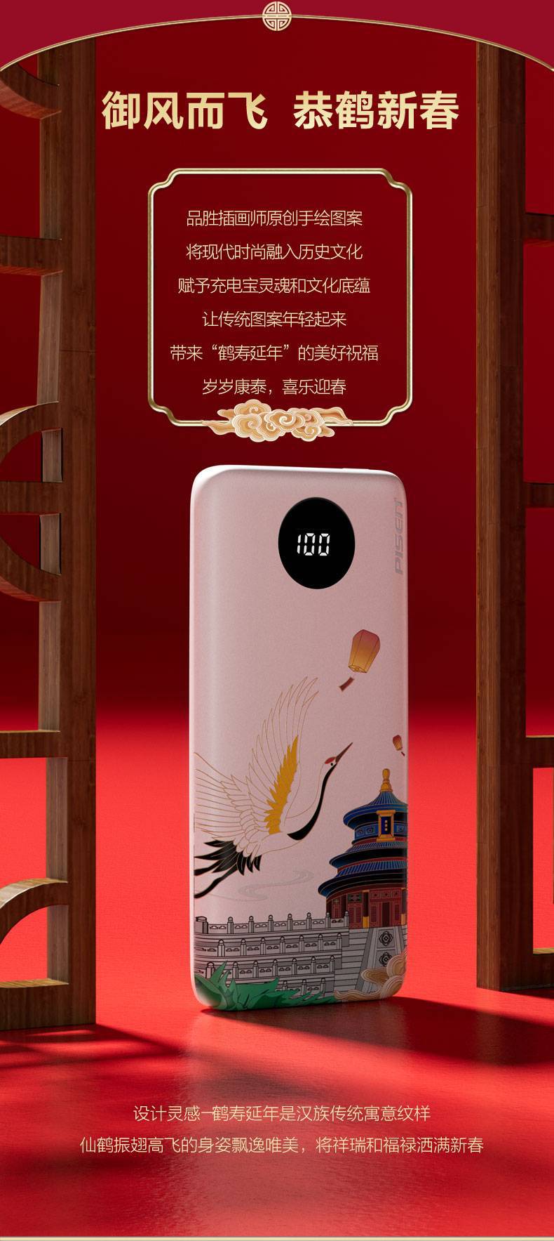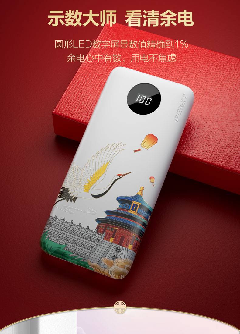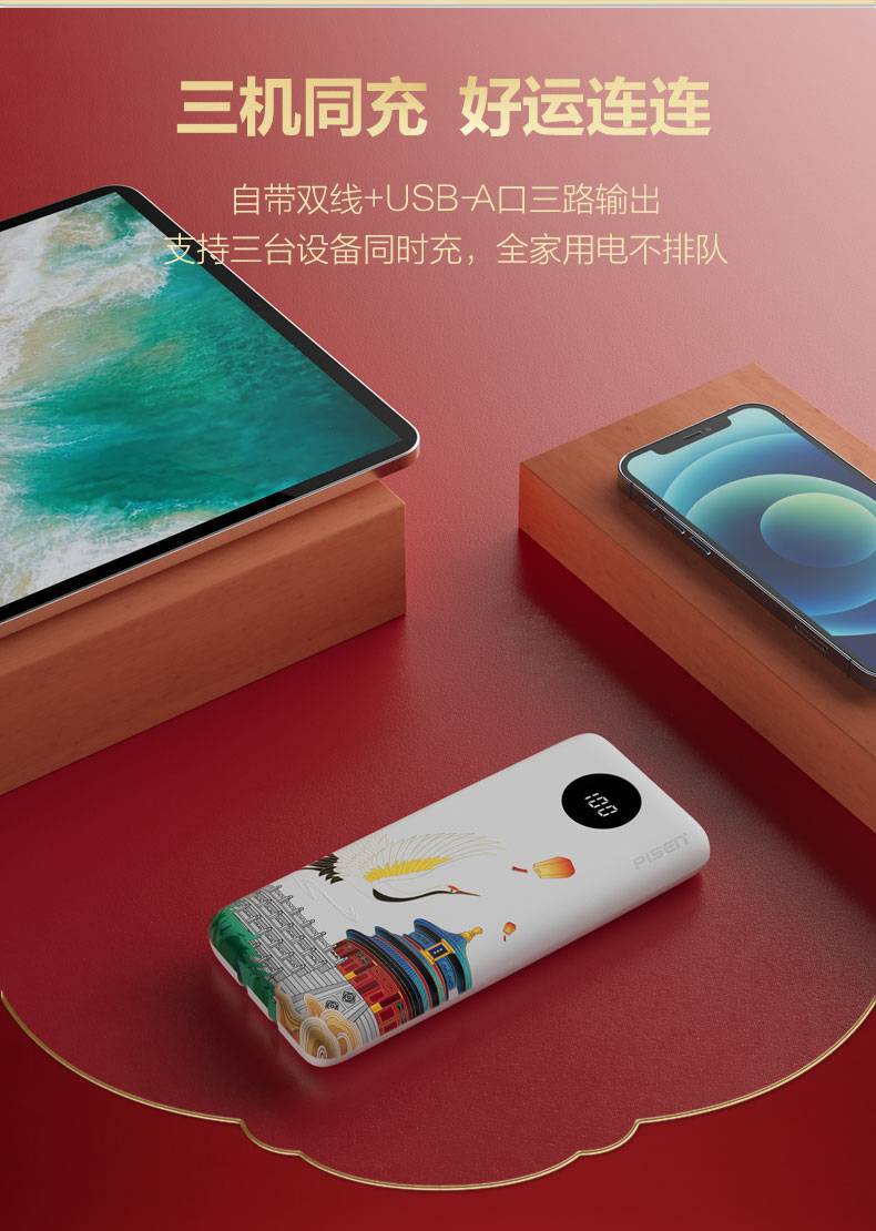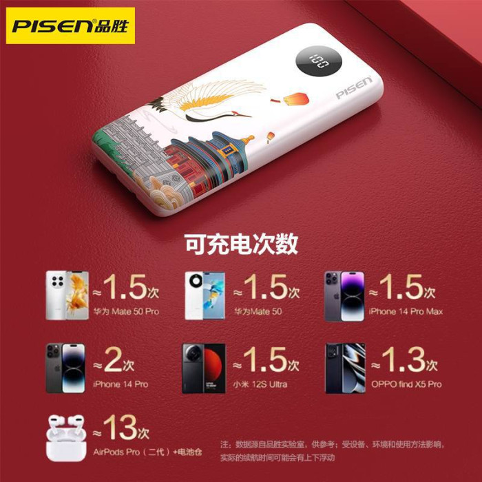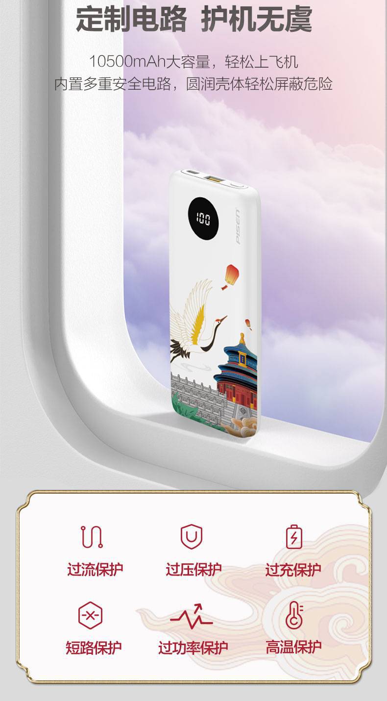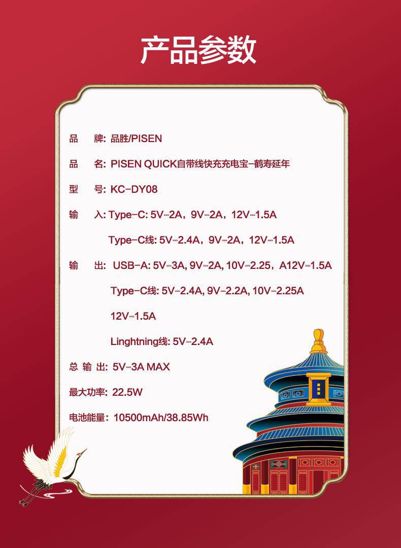 電源容量 | 自帶雙線22.5W快充電寶10500(鶴壽延年) |