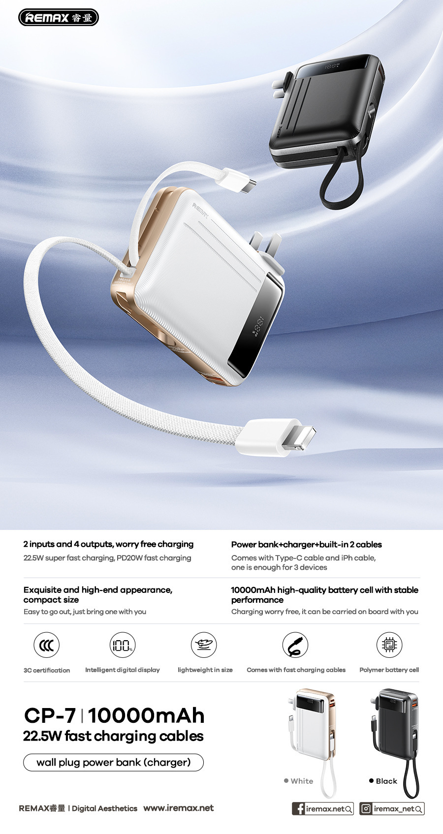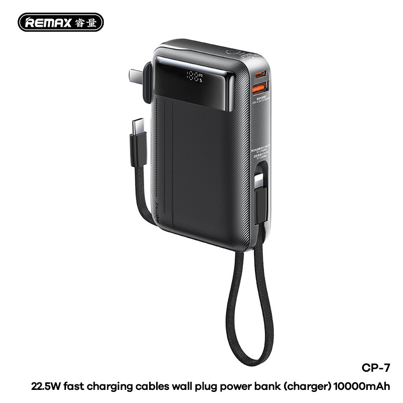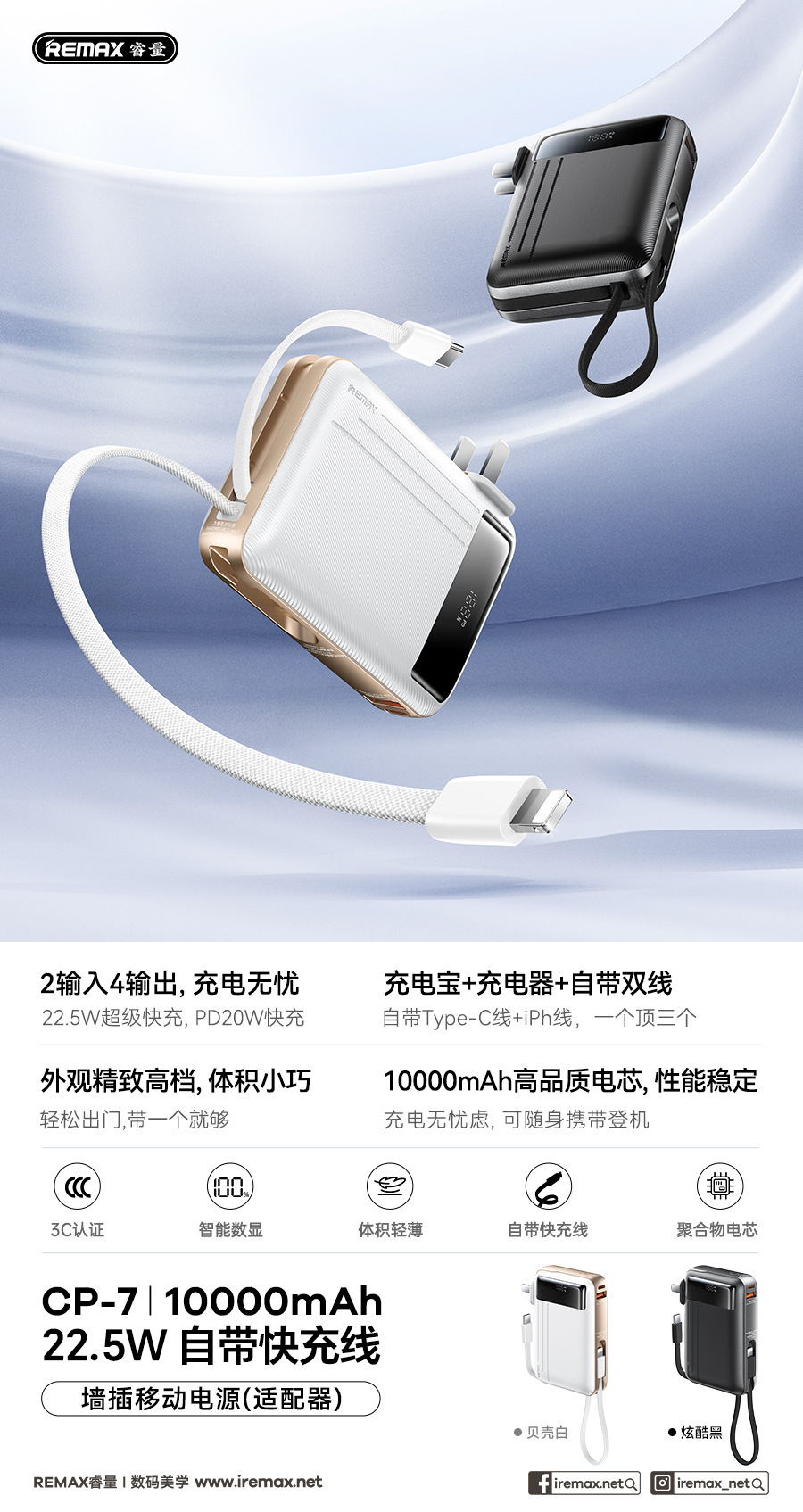 REMAX22.5W自帶線快充充電寶牆插10000安培帶插頭行動電源3C認証
