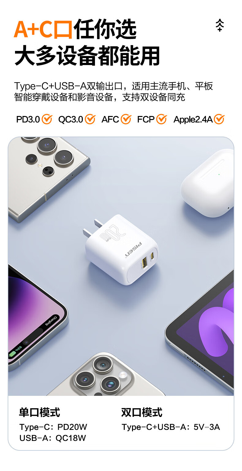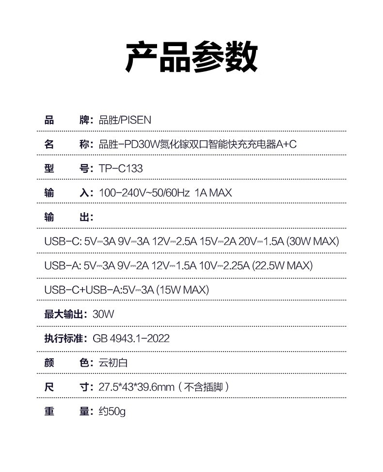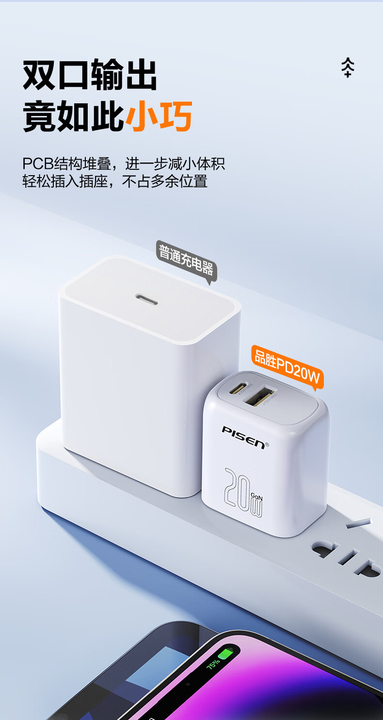 品勝PD20W雙口氮化鎵充電器多口Type-C快充插頭PD30W適用iPhone16