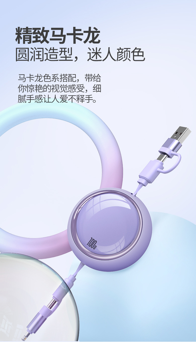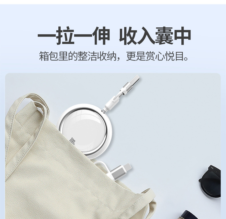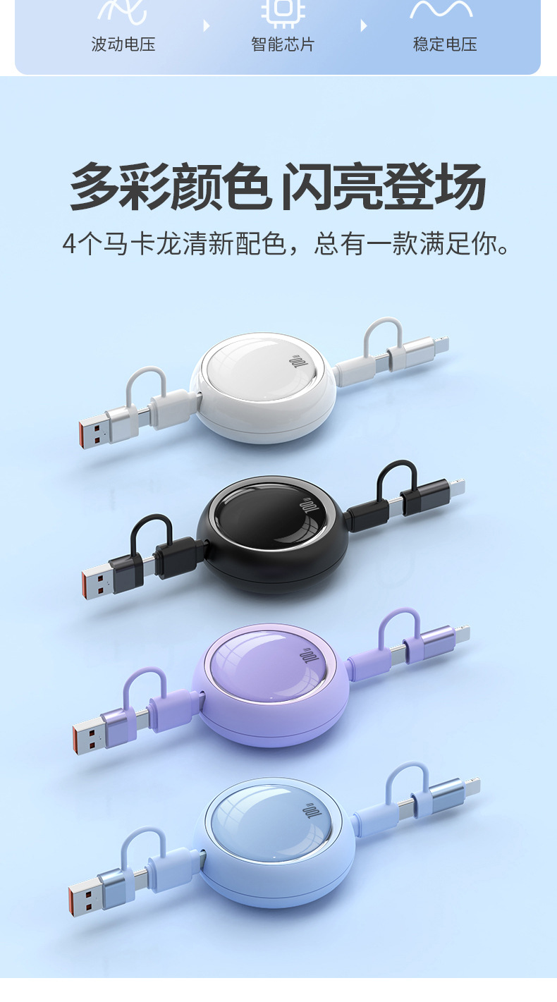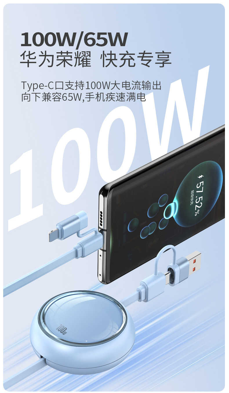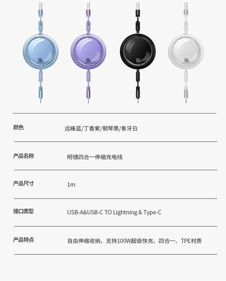 圓鏡四合一伸縮數據線100W快充電源線適用蘋果安卓Type-c華爲車用