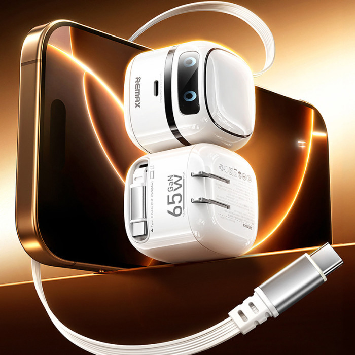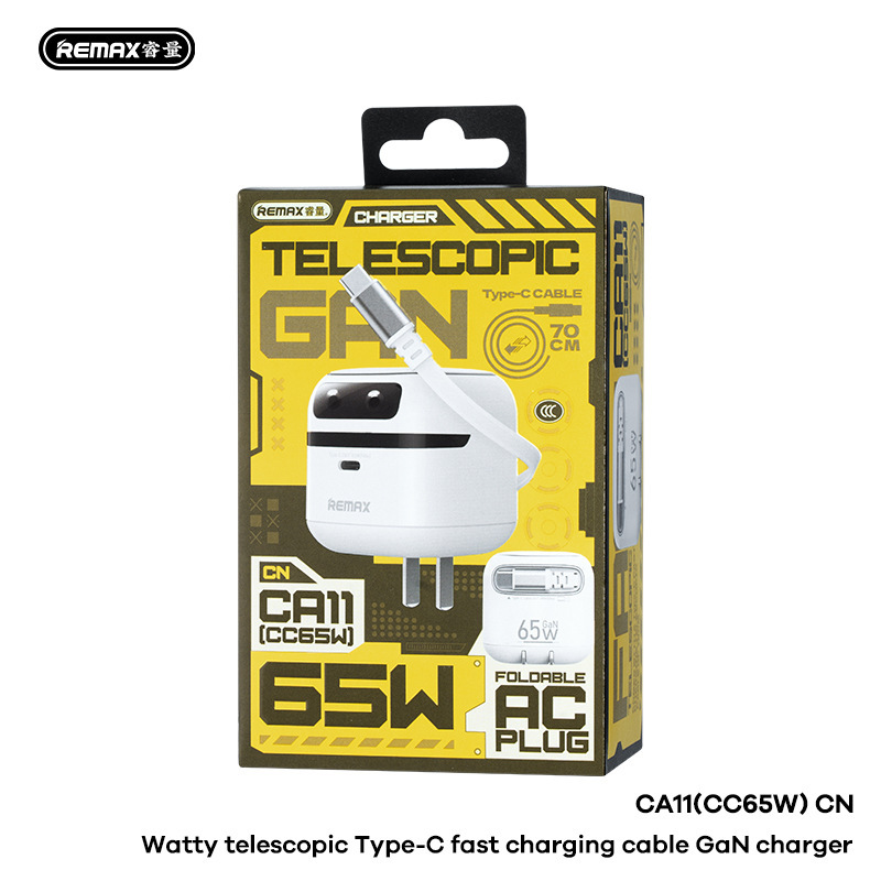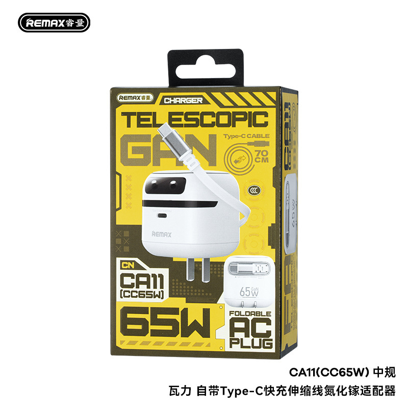 Remax氮化鎵65W快充自帶線手機充電器Type-C伸縮線充電頭折曡插頭