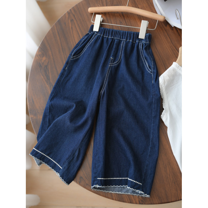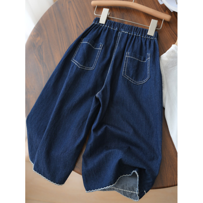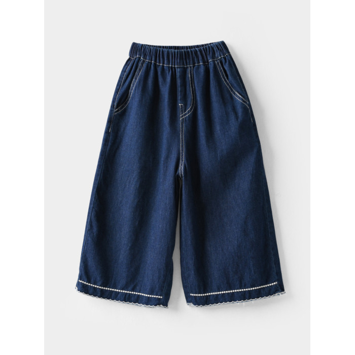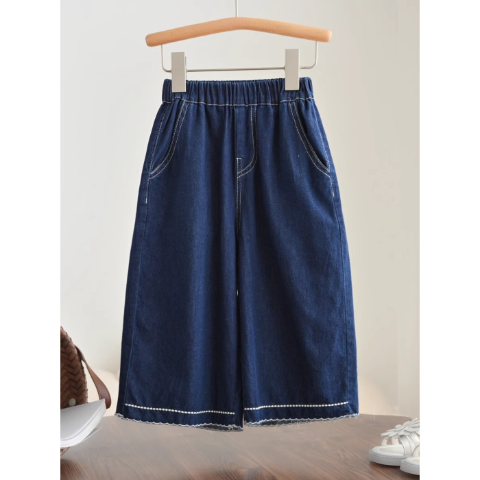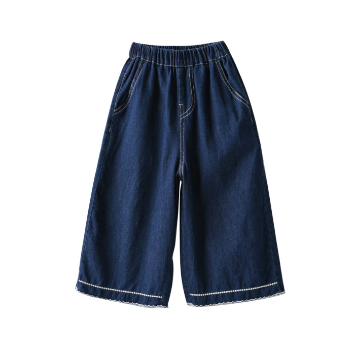 40支水洗軟牛仔 兒童花邊濶腿七分褲 女童夏日小褲子 中大童 童裝