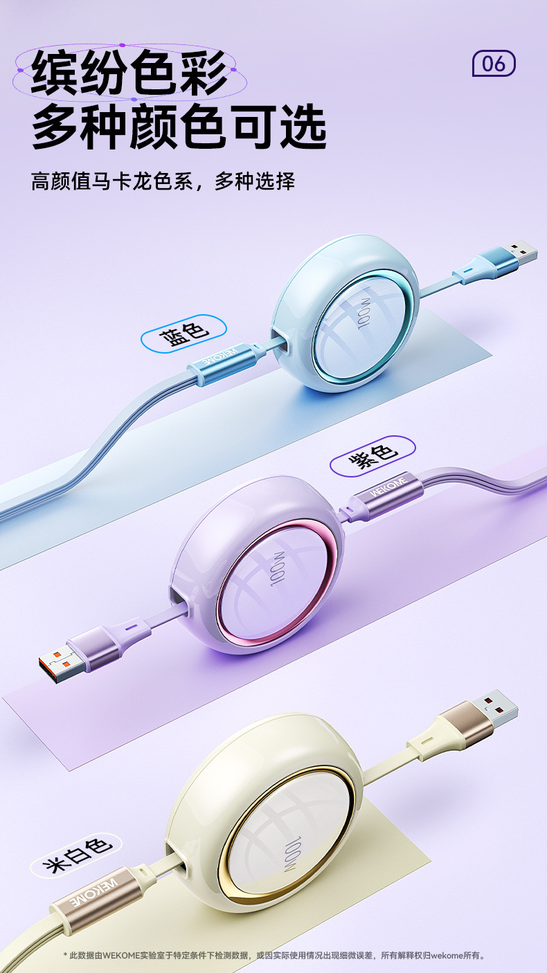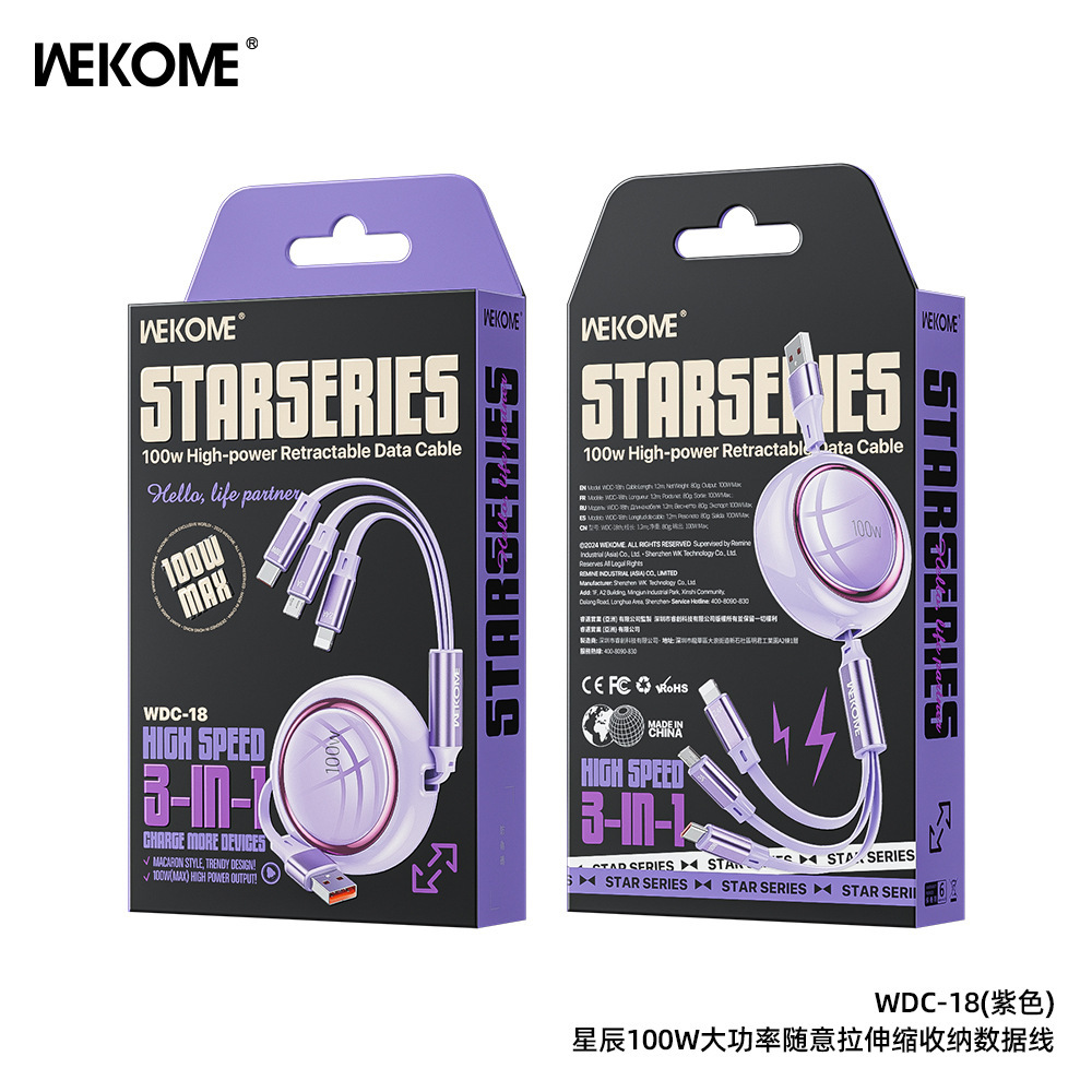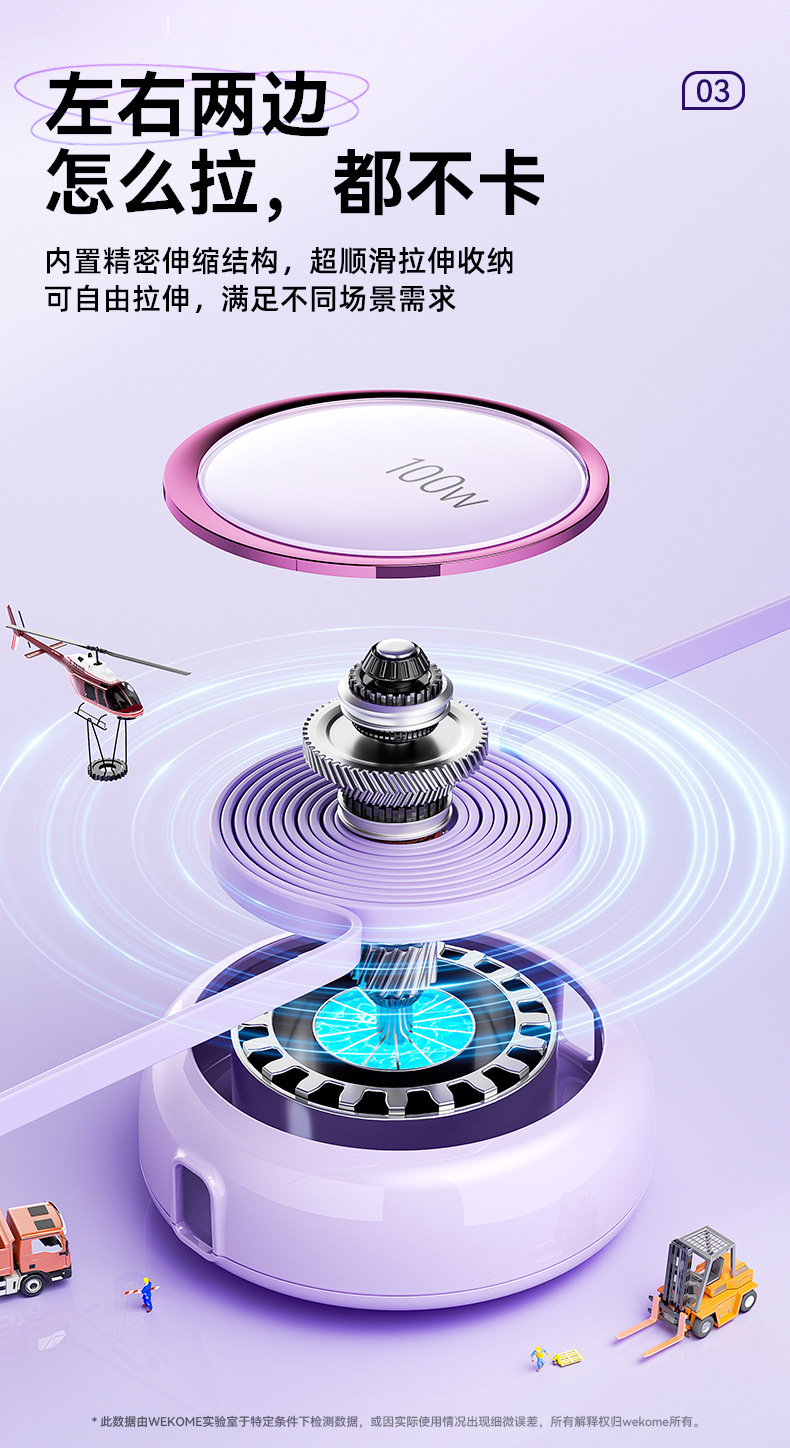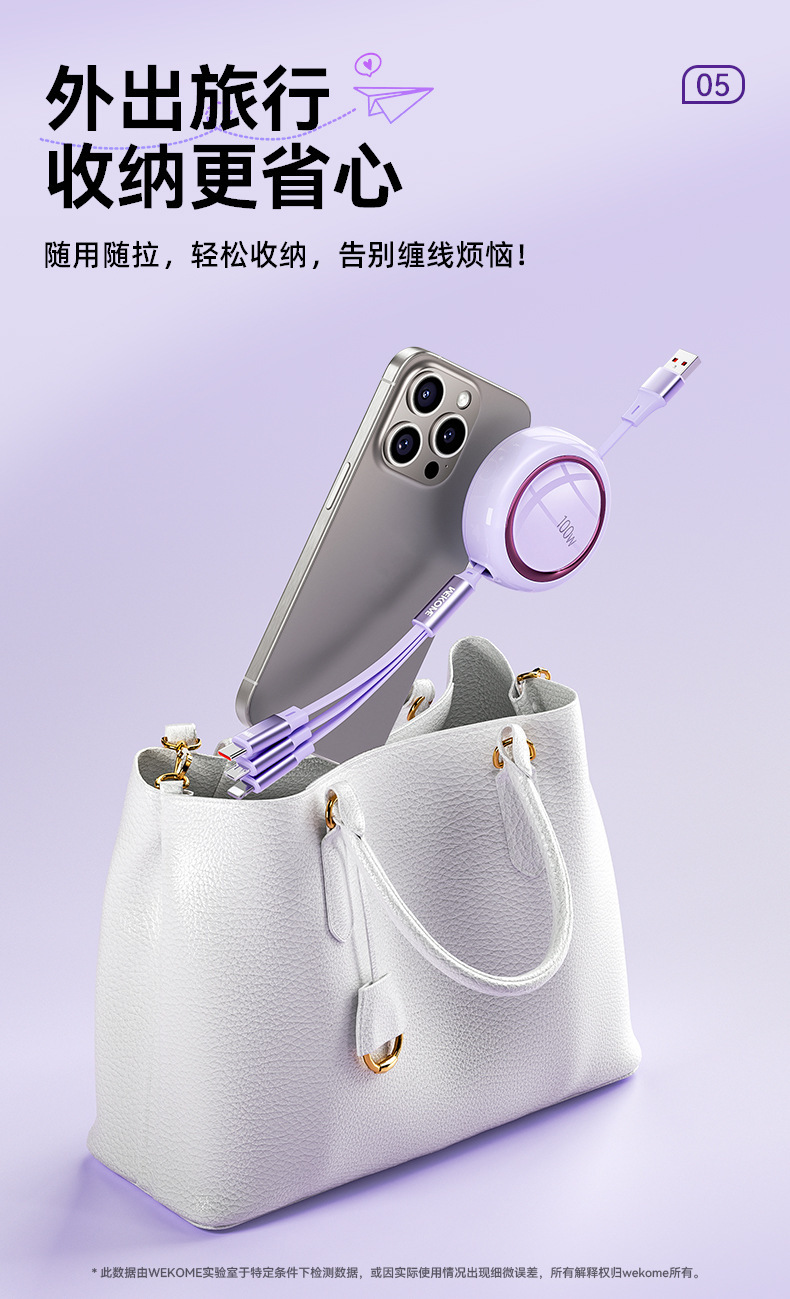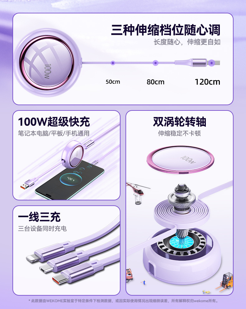 WEKOME爆款100W伸縮收納數據線拉 適用蘋果華爲車用一拖三充電線