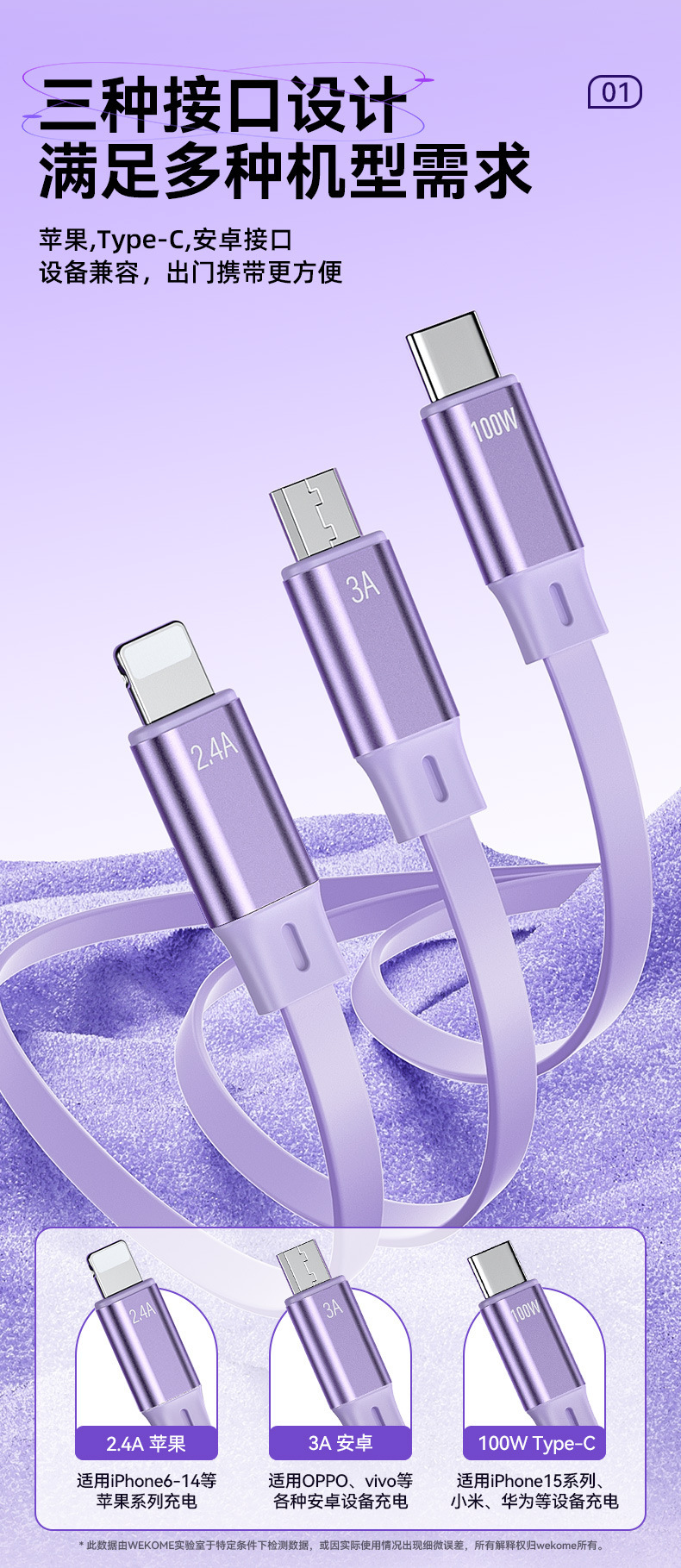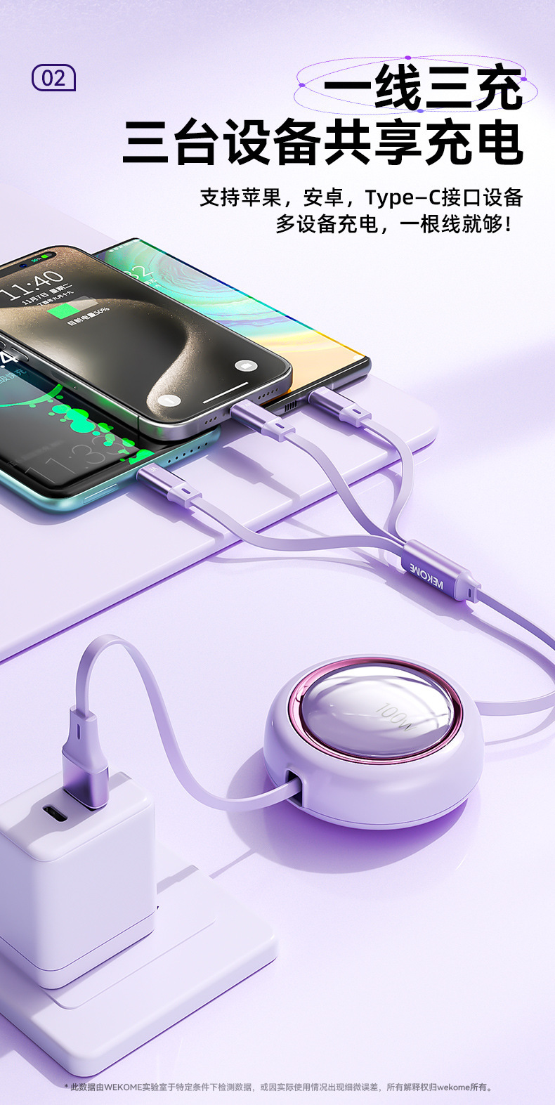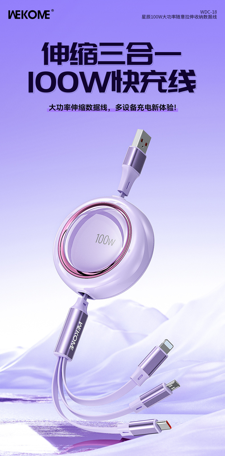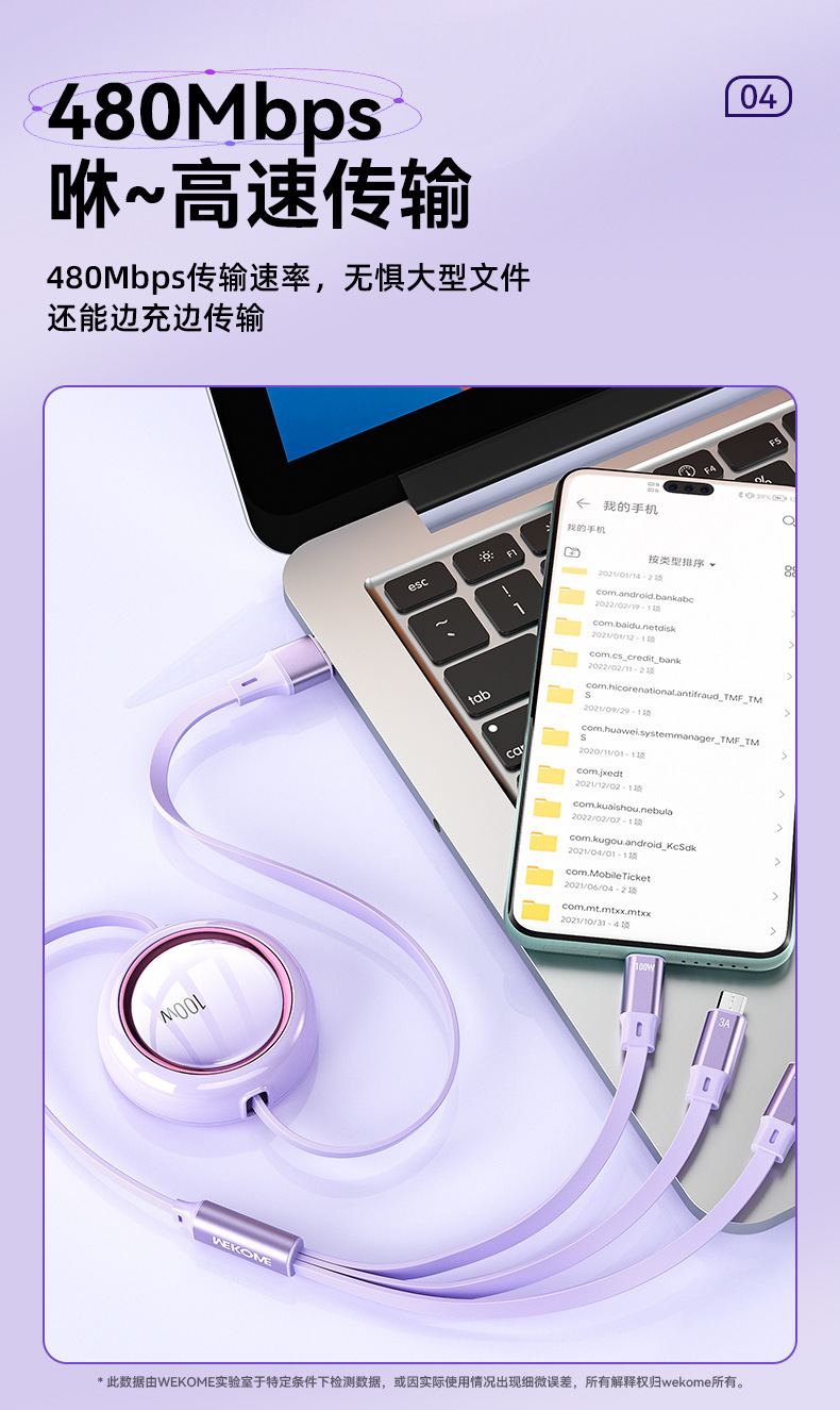 WEKOME爆款100W伸縮收納數據線拉 適用蘋果華爲車用一拖三充電線
