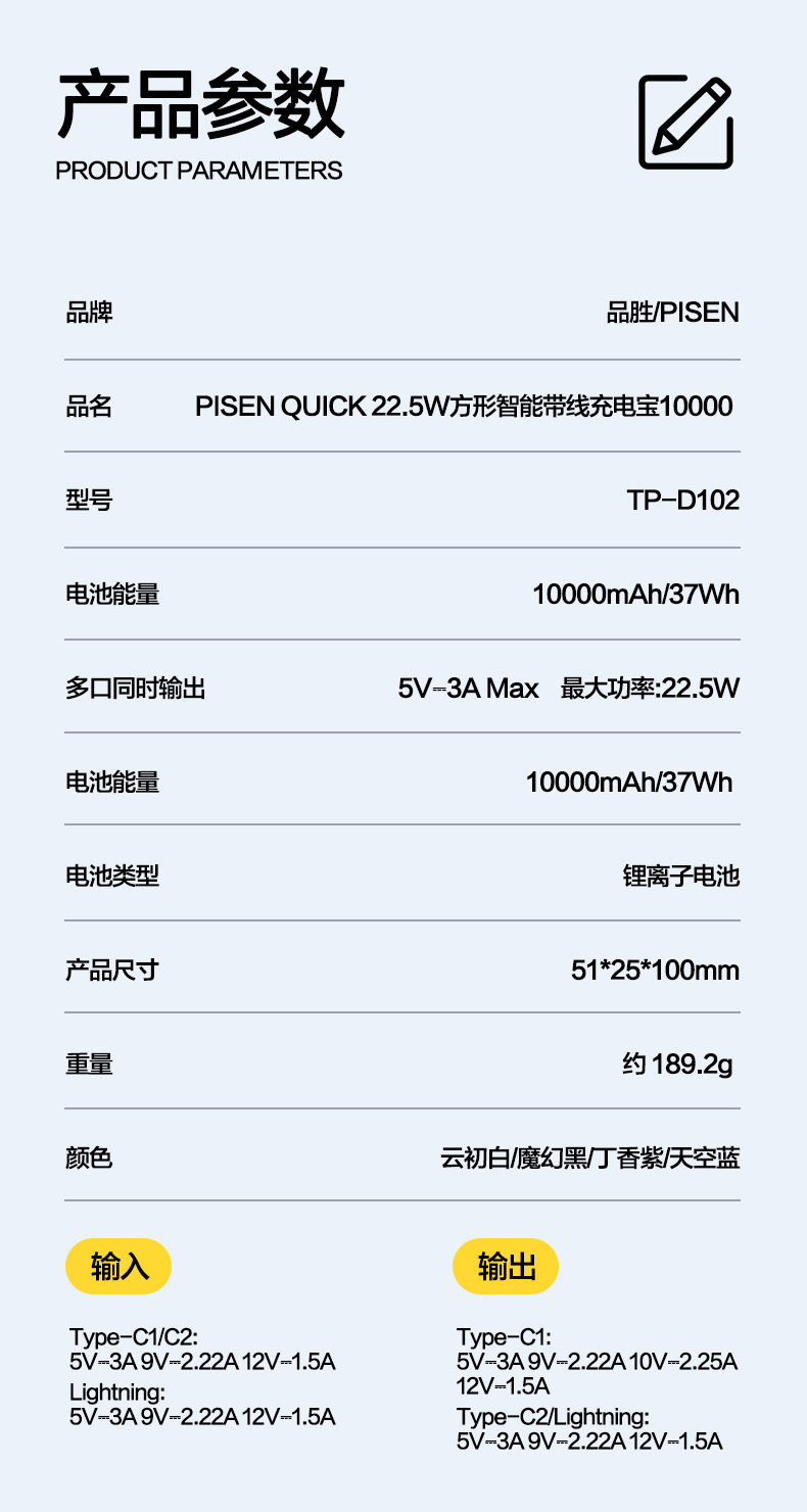 型號 22.5W方形智能帶線充電寶10000(TP-D102