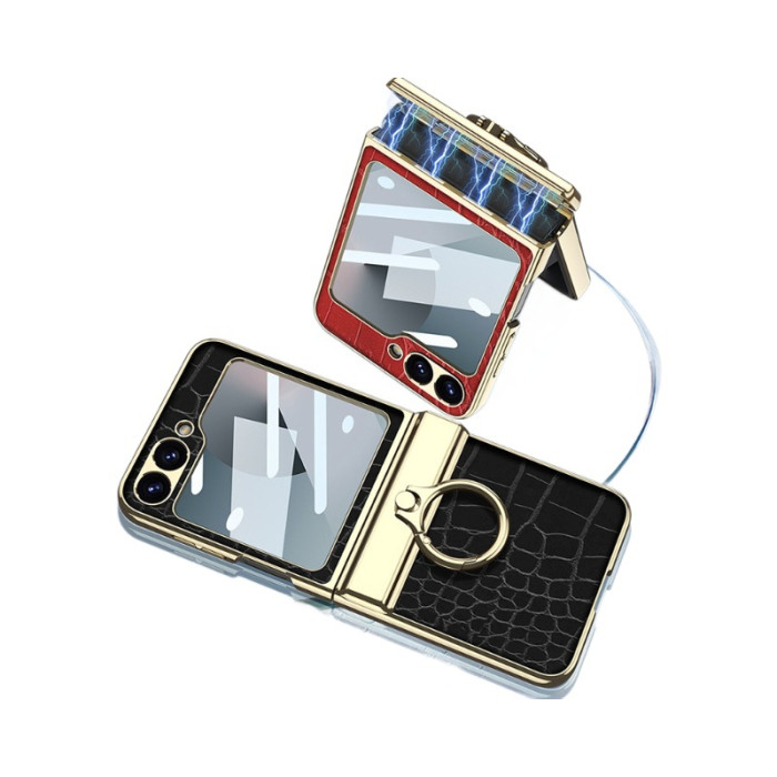 適用三星Z Flip6電鍍素皮手機殼flip6鱷魚皮紋折曡指環鉸鏈保護套